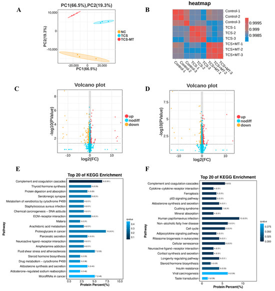 To investigate the impact of TCS and the rescue effect of MT at the proteomic level, we conducted quantitative proteomic profiling. PCA results showed a clear segregation of the three experimental groups, and the high degree of consistency among biological replicates within each group indicated excellent reproducibility of the data (Figure 4A). Comparative analysis identified 289 differentially expressed proteins (DEPs) after TCS exposure (95 upregulated, 194 downregulated). MT treatment significantly modulated the expression of 342 DEPs compared to the TCS group (164 upregulated, 178 downregulated) (Figure 4C,D).