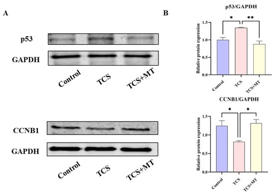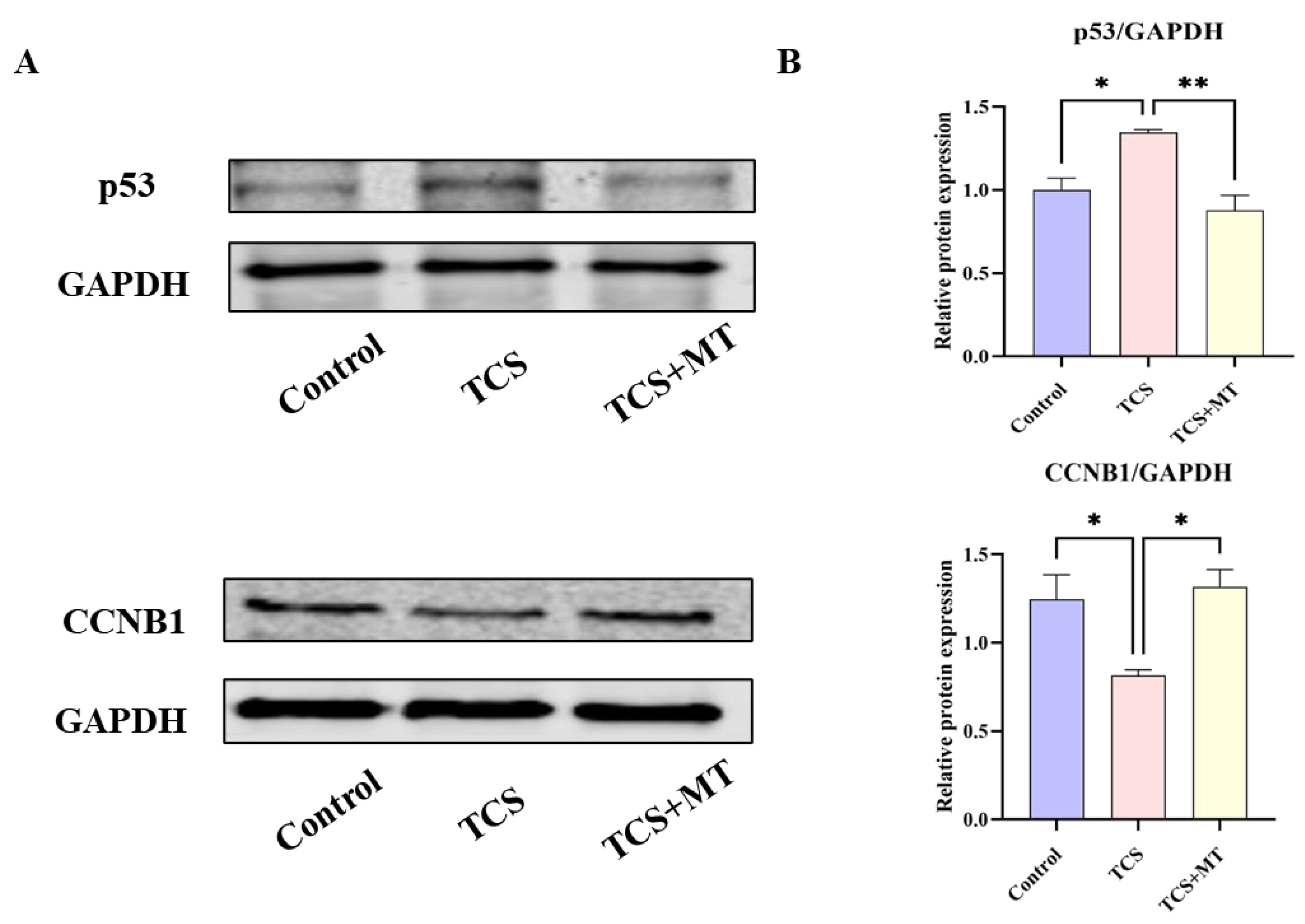 To validate the role of the p53 signaling pathway in TCS-induced toxicity and MT-mediated protection, we quantified the protein expression levels of p53 and CCNB1 using Western blot analysis normalized to GAPDH (Figure 5A). Compared with the control group, TCS exposure significantly upregulated p53 expression (p < 0.05) and downregulated CCNB1 expression (p < 0.05). Importantly, MT treatment restored both p53 (p < 0.01) and CCNB1 (p < 0.05) expression to physiological levels, suggesting that reactivation of the p53 pathway by melatonin alleviates TCS-induced cellular damage (Figure 5B). This biochemical validation supports our earlier KEGG pathway enrichment analysis and confirms that p53 signaling is a central mechanism underlying the protective effects of melatonin.