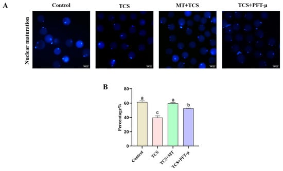 Figure 7. p53 inhibition partially rescues TCS-impaired nuclear maturation in porcine oocytes. (A) Representative fluorescence images of the first polar body in oocytes from the Control, TCS, TCS + MT, and TCS + PFT-μ groups. Scale bar = 100 μm. (B) First polar body extrusion rate in oocytes from the indicated groups. Different letters above bars indicate significant differences (p < 0.05).