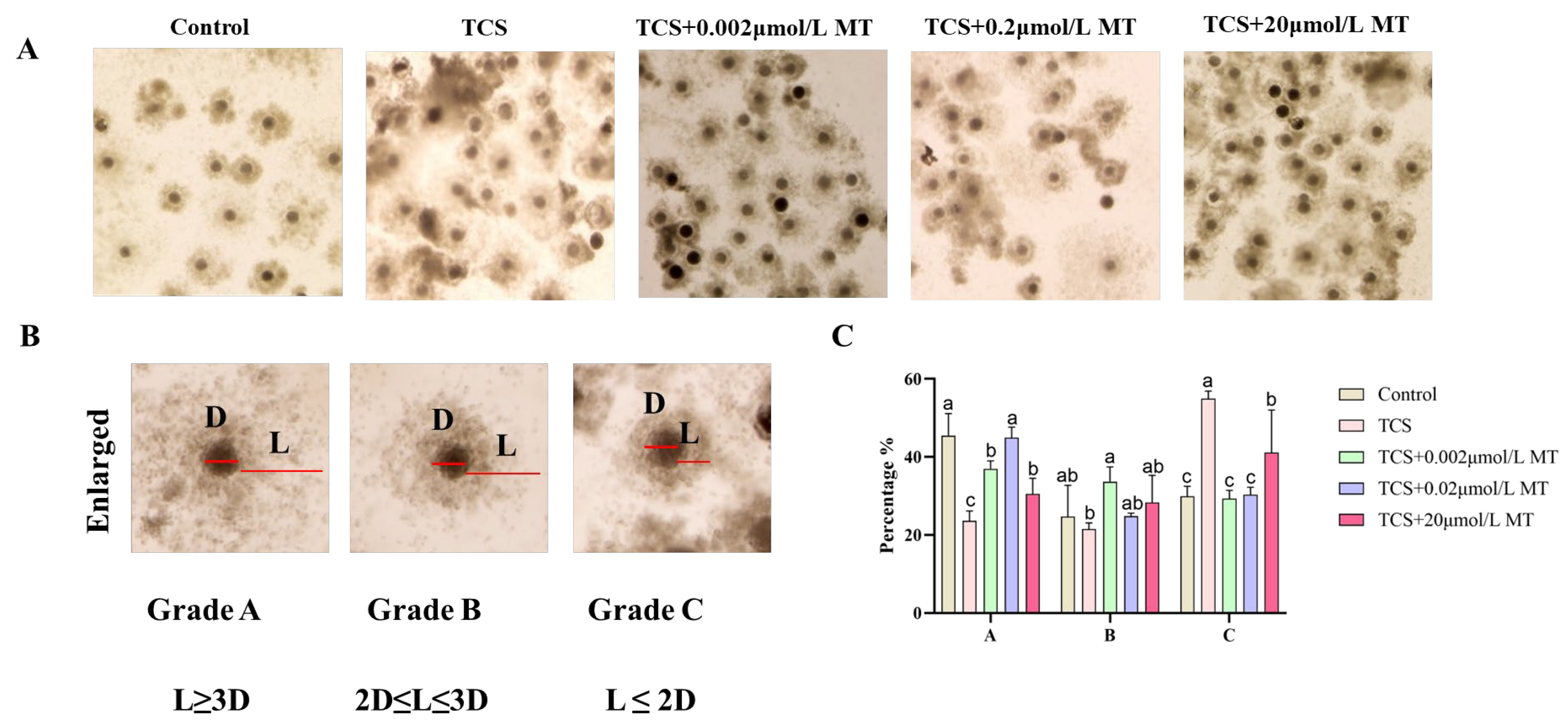 Figure 2. Melatonin counteracts TCS-induced suppression of cumulus expansion in porcine oocytes. (A) Representative morphology of COC expansion in the control, TCS, and TCS + MT groups (0.002, 0.2, and 20 μmol/L). (B) Classification of COC expansion: Grade A (fully expanded), Grade B (partially expanded), and Grade C (poorly expanded). (C) Statistical analysis of COC expansion grades in oocytes from the control, TCS, and TCS + MT groups (0.002, 0.2, and 20 μmol/L). Different letters above bars indicate significant differences (p < 0.05).