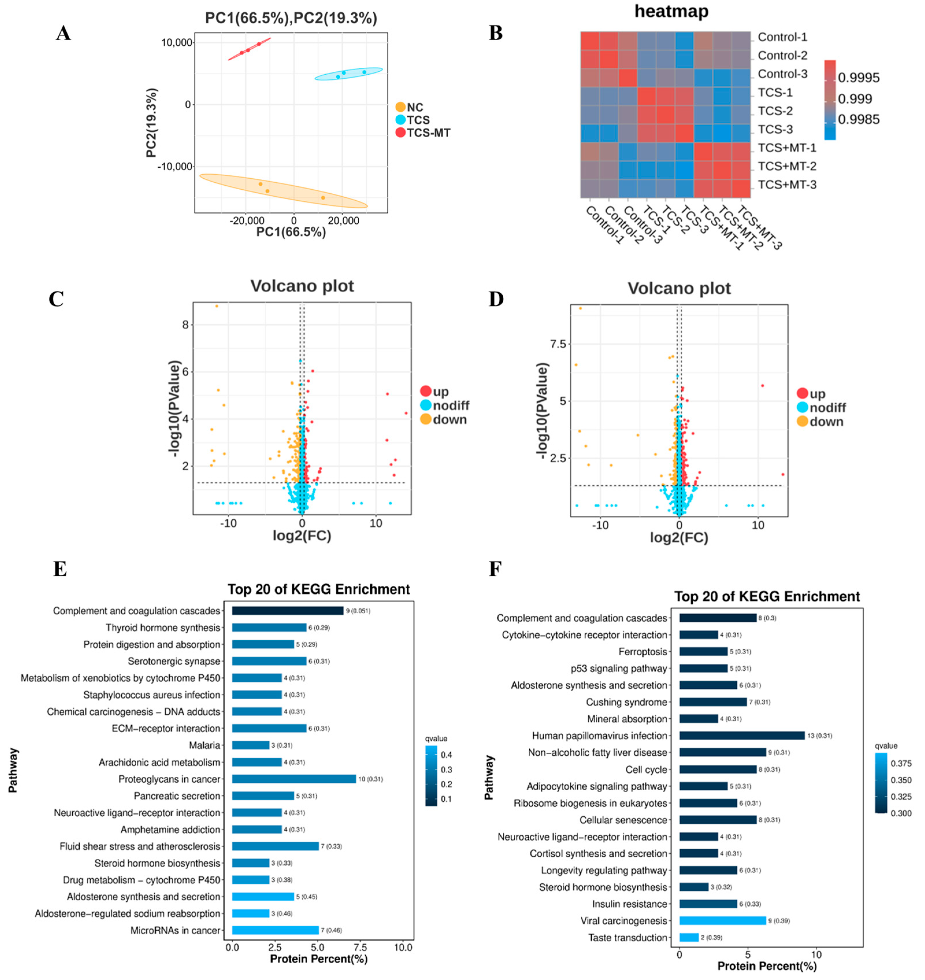 Figure 4. Melatonin attenuates TCS-induced toxicity through regulation of the p53 pathway. (A) Principal component analysis (PCA) of the proteomic profiles across all experimental groups. (B) Heatmap depicting Pearson correlation coefficients between individual samples. (C) Volcano plot displaying differentially expressed proteins (DEPs) in the Control vs. TCS comparison. (D) Volcano plot of DEPs in the TCS vs. TCS + MT comparison. (E) KEGG pathway enrichment analysis of DEPs identified from the Control vs. TCS comparison. (F) KEGG pathway enrichment analysis of DEPs identified from the TCS vs. TCS + MT comparison.