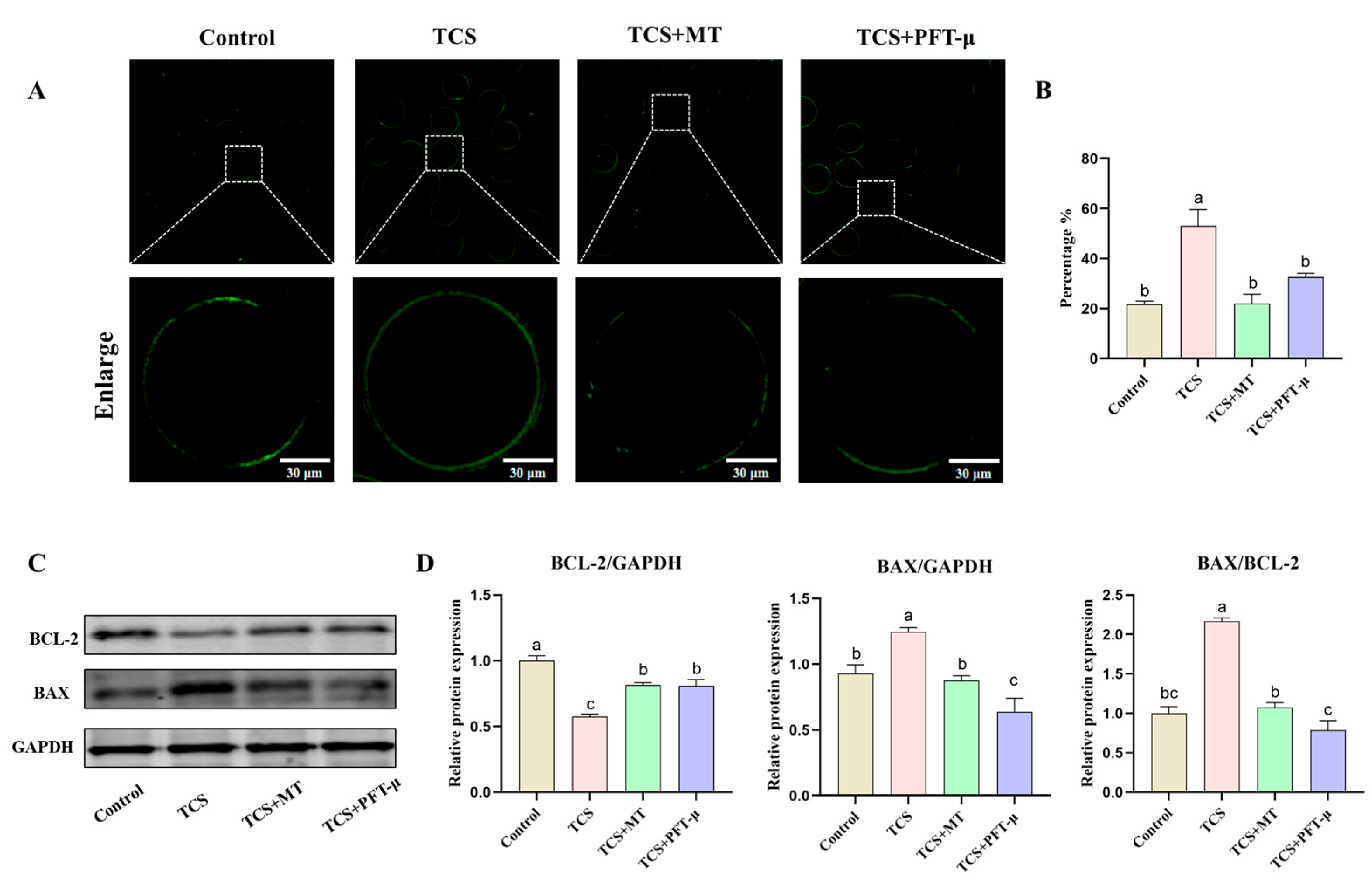 Figure 6. Pharmacological inhibition of p53 attenuates TCS-induced apoptosis and disrupts melatonin-mediated restoration of apoptotic protein balance. (A) Representative fluorescence images of early apoptosis (Annexin V-FITC staining) in oocytes from the Control, TCS, TCS + MT, and TCS + PFT-μ groups. Scale bar = 30 μm. (B) Rate of early apoptosis across different treatment groups. (C) Representative Western blot images of BCL-2, BAX, and GAPDH protein expression. (D) Densitometric analysis of relative BAX protein levels, BCL-2 protein levels, and the BAX/BCL-2 ratio, normalized to GAPDH. Different letters above bars indicate significant differences (p < 0.05).