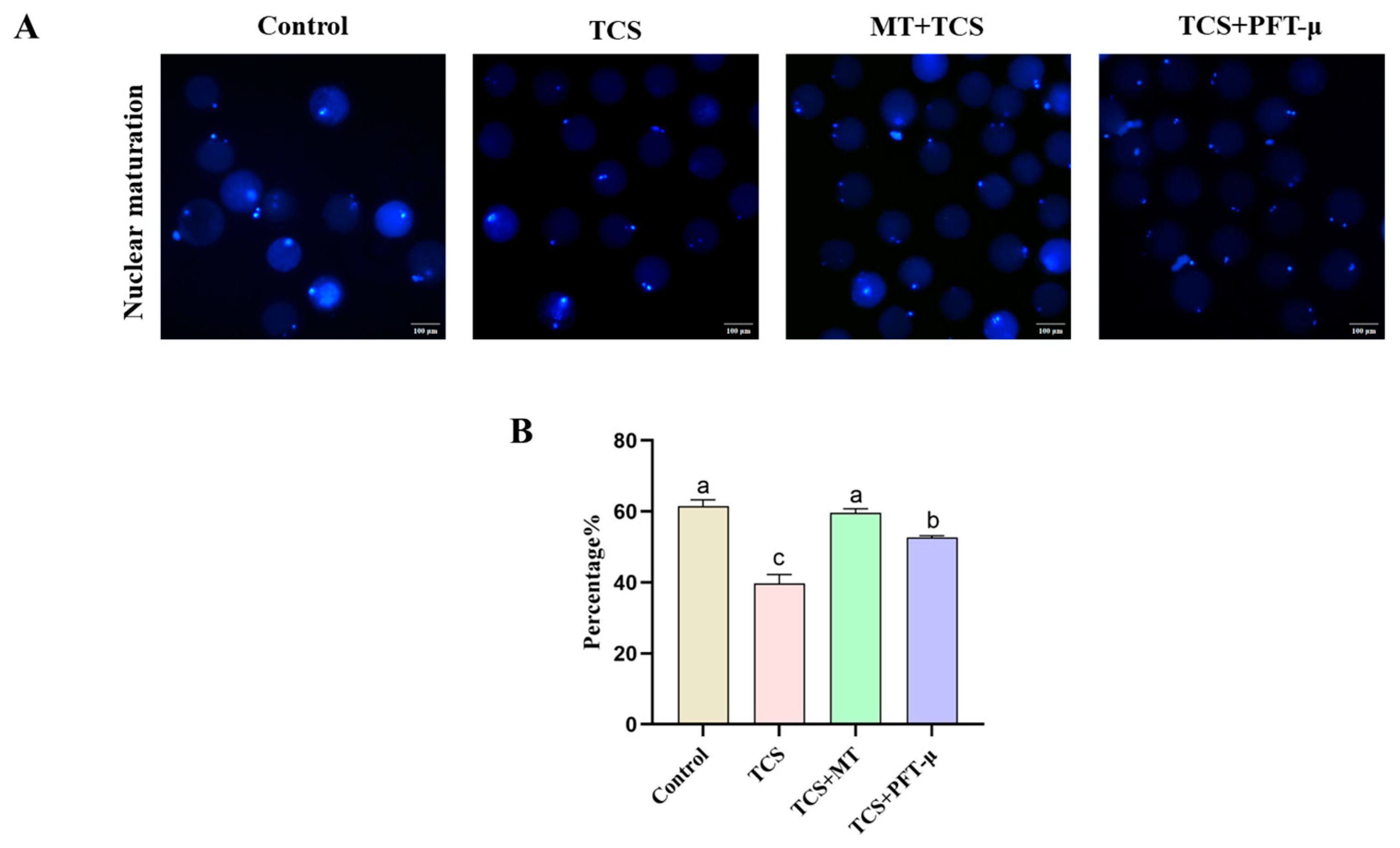 3.1. Melatonin Rescues TCS-Impaired Nuclear Maturation in Porcine Oocytes