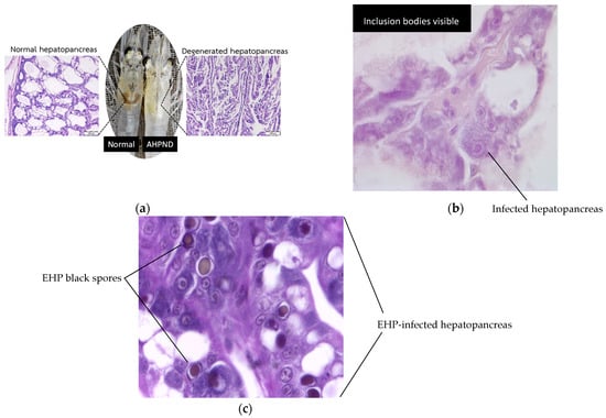 Representative histopathological images of shrimp hepatopancreas tissues. (a) Acute hepatopancreatic necrosis disease (AHPND): comparison between normal hepatopancreas (left) and degenerated hepatopancreas (right) from Vibrio parahaemolyticus-infected shrimp showing several epithelial cells sloughing and tubule atrophy. (b) Hepatopancreatic parvovirus (HPV) infection caused by Penaeus monodon densovirus (PmoDNV): hypertrophied nuclei with distinct basophilic intranuclear inclusion bodies. (c) Hepatopancreatic microsporidiosis (HPM) caused by Enterocytozoon hepatopenaei (EHP): presence of intracellular spores within hepatopancreatic epithelial cells and free spores in tubule lumens. All samples were stained with hematoxylin and eosin for microscopic examination.