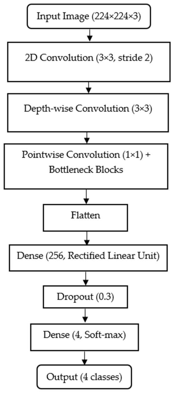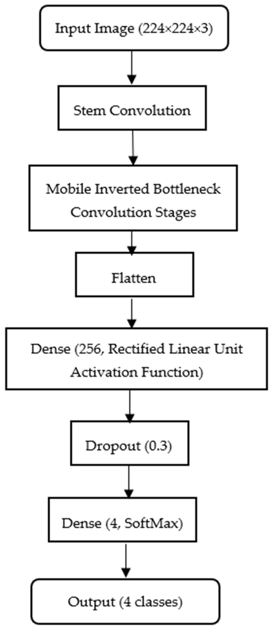 To contextualize computational demands and deployment feasibility, the two models in this study, together with the added custom classification head, demand the parameters. For MobileNet (Keras MobileNet, include_top = False, input 224 × 224 × 3), the backbone contains approximately 3.2M parameters. With the study’s custom head (Flatten → Dense (256, ReLU) → Dropout (0.3) → Dense (4, softmax)), the total trainable parameters are approximately 16.1 M (the Dense (256) layer dominates due to the 7 × 7 × 1024 terminal feature map feeding a 50,176 → 256 projection). For EfficientNet (include_top = False, 224 × 224 × 3), the backbone contains approximately 28M parameters; the same custom head increases the total to approximately 53.7M (driven by the 7 × 7 × 2048 terminal tensor feeding the 100,352 → 256 projection). The parameter counts were verified using the model.summary() function in TensorFlow to ensure accuracy.