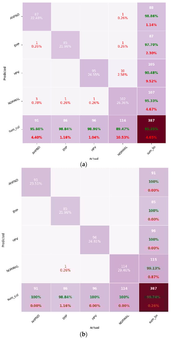 Confusion matrices for the two convolutional neural network models used in shrimp disease classification: (a) EfficientNet; (b) MobileNet. The diagonal elements indicate correct classifications, while the non-diagonal elements represent misclassifications.