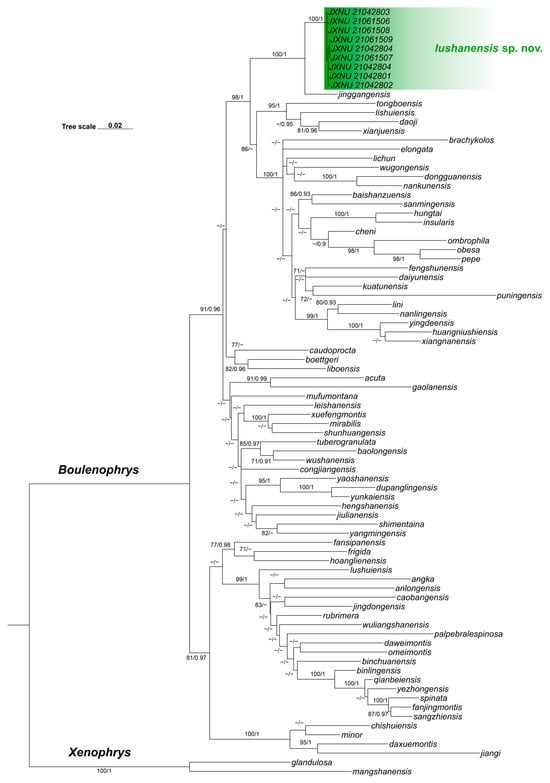 The following supporting information can be downloaded at: https://www.mdpi.com/article/10.3390/ani15213197/s1, Table S1: Literature for morphological characters of 77 recognized species of Boulenophrys [,,,,,,,,,,,,,,,,,,,,,,,,,,,,,,,,,,,,,,,]; Table S2: Sample list of genus Boulenophrys and outgroups for phylogenetic analysis in this study; Table S3: Uncorrected p-distance (%) among Boulenophrys species from the COI; Audio S1: Advertisement call recordings of Boulenophrys lushanensis sp. nov. and Boulenophrys jinggangensis.