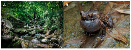 Habitat of Boulenophrys lushanensis sp. nov. at the type locality: (A) Stream habitat within low-elevation evergreen forest; (B) calling male paratype (JXNU 21042802) perched on a rock.