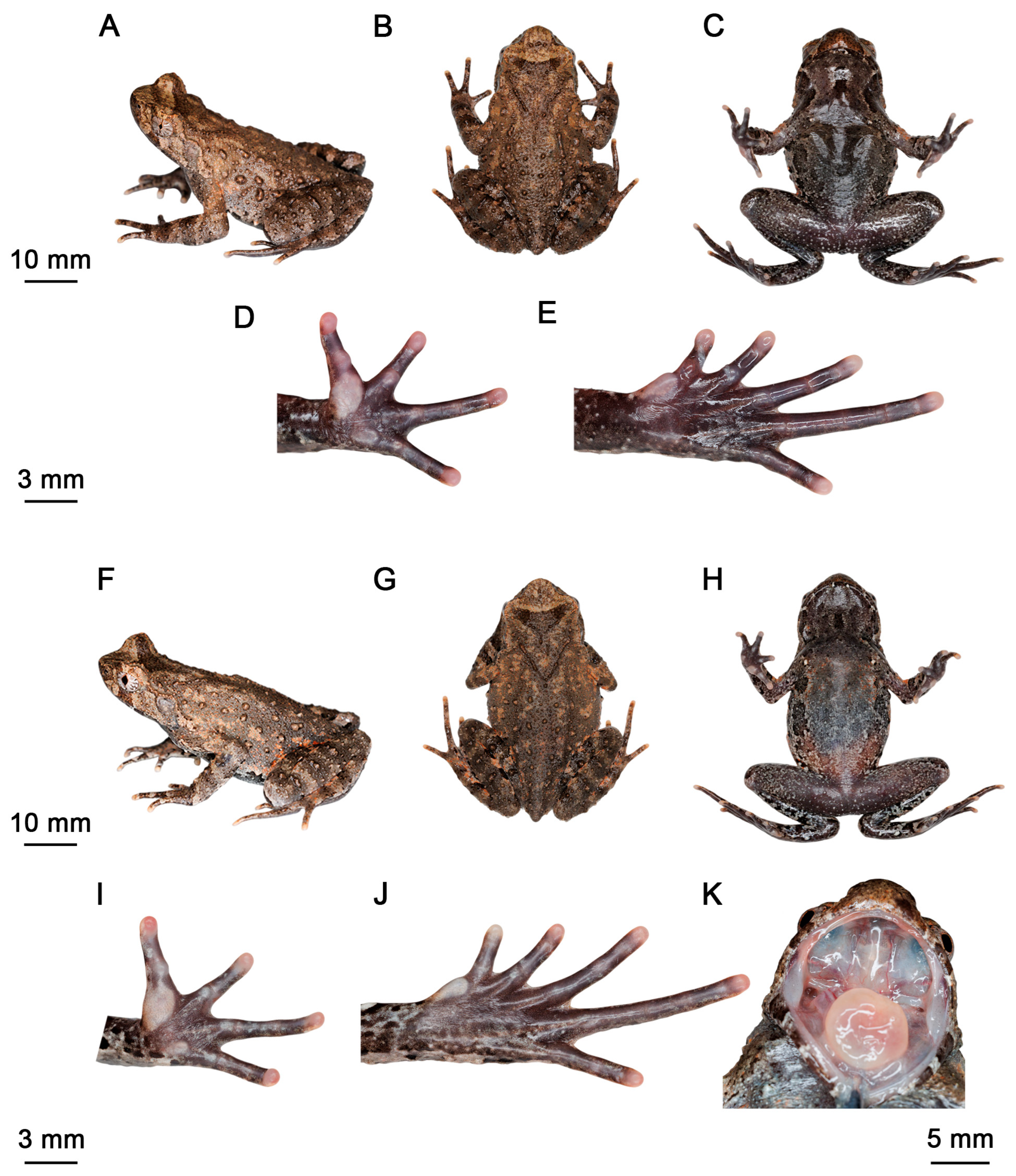Boulenophrys lushanensis sp. nov. in life. Holotype (JXNU 21042803): (A) lateral view; (B) dorsal view; (C) ventral view; (D) volar view of left hand; (E) plantar view of left foot. Female paratype (JXNU 21061505): (F) lateral view; (G) dorsal view; (H) ventral view; (I) volar view of left hand; (J) plantar view of left foot; (K) edge of tongue.