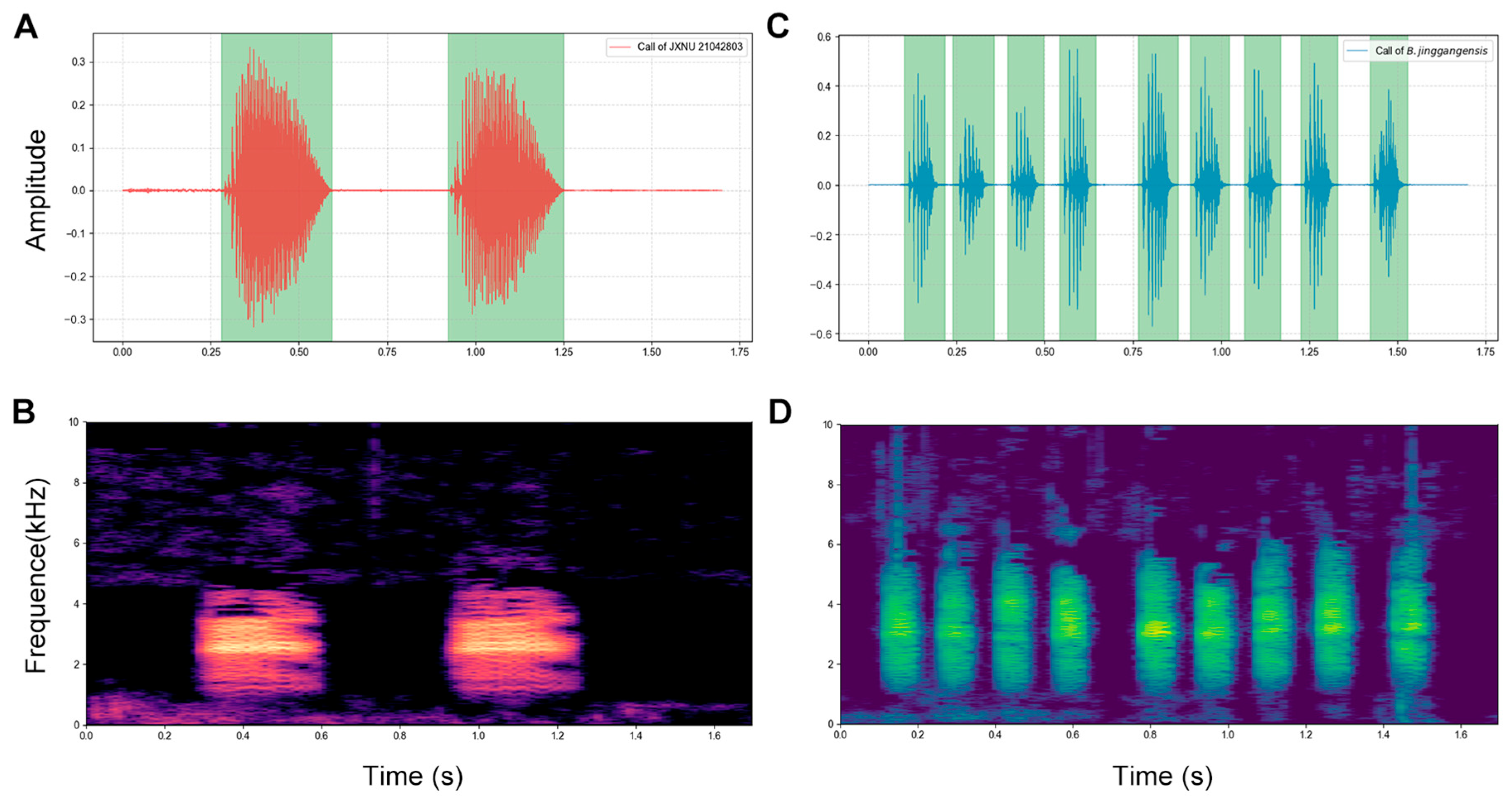 1.7 s advertisement call segments. Boulenophrys lushanensis sp. nov. (male holotype JXNU 21042803): (A) waveform; (B) spectrogram. Boulenophrys jinggangensis (unvouchered specimen from its type locality): (C) waveform; (D) spectrogram.