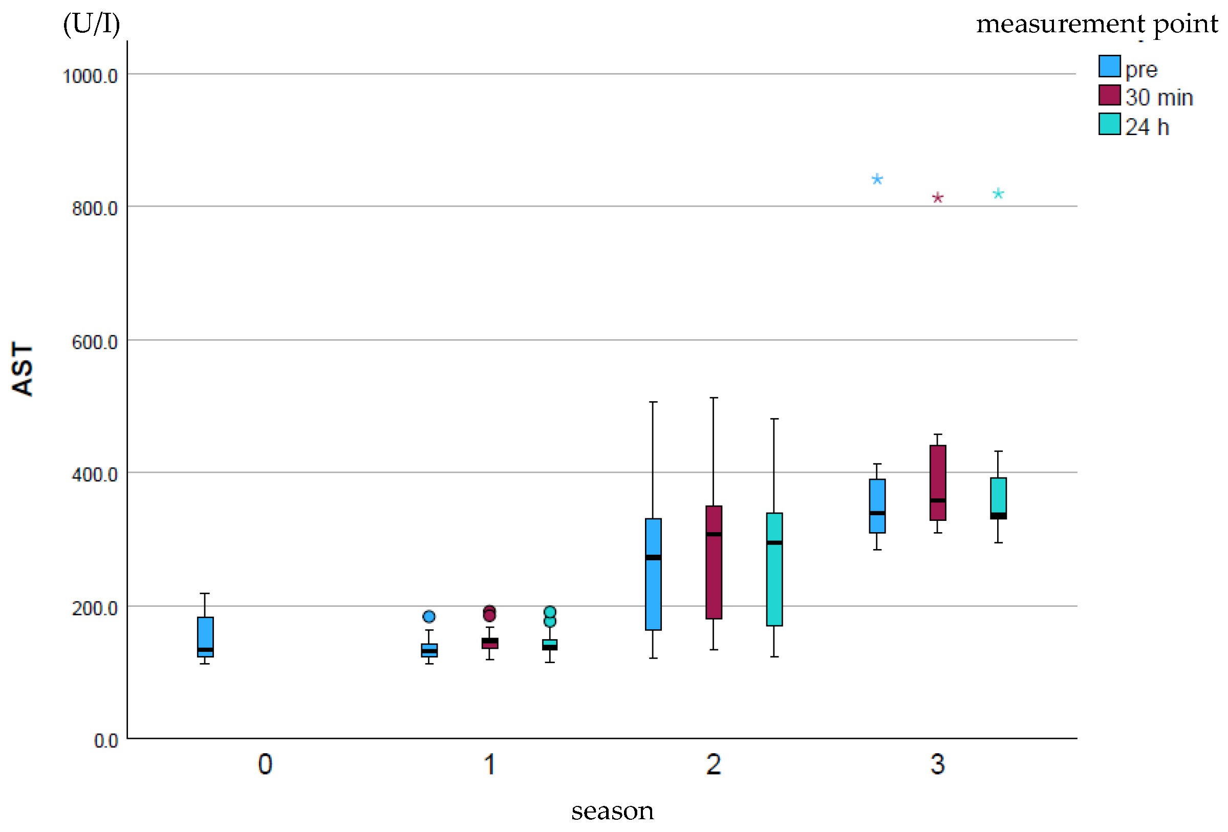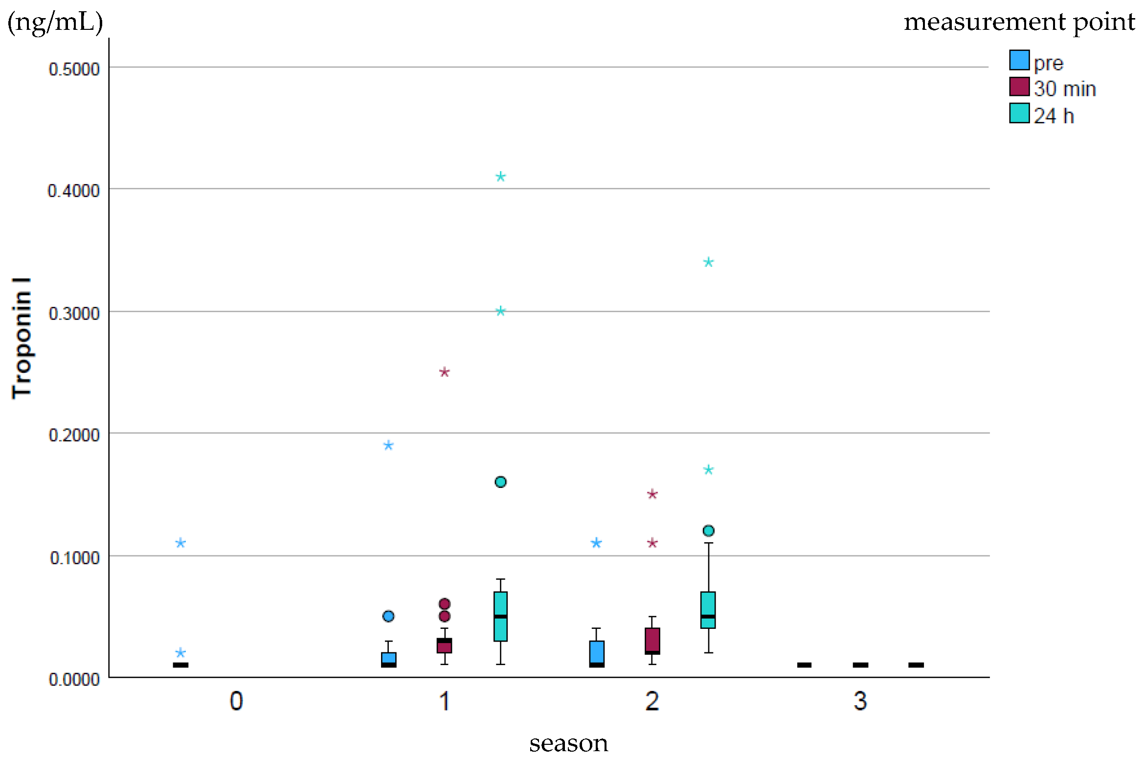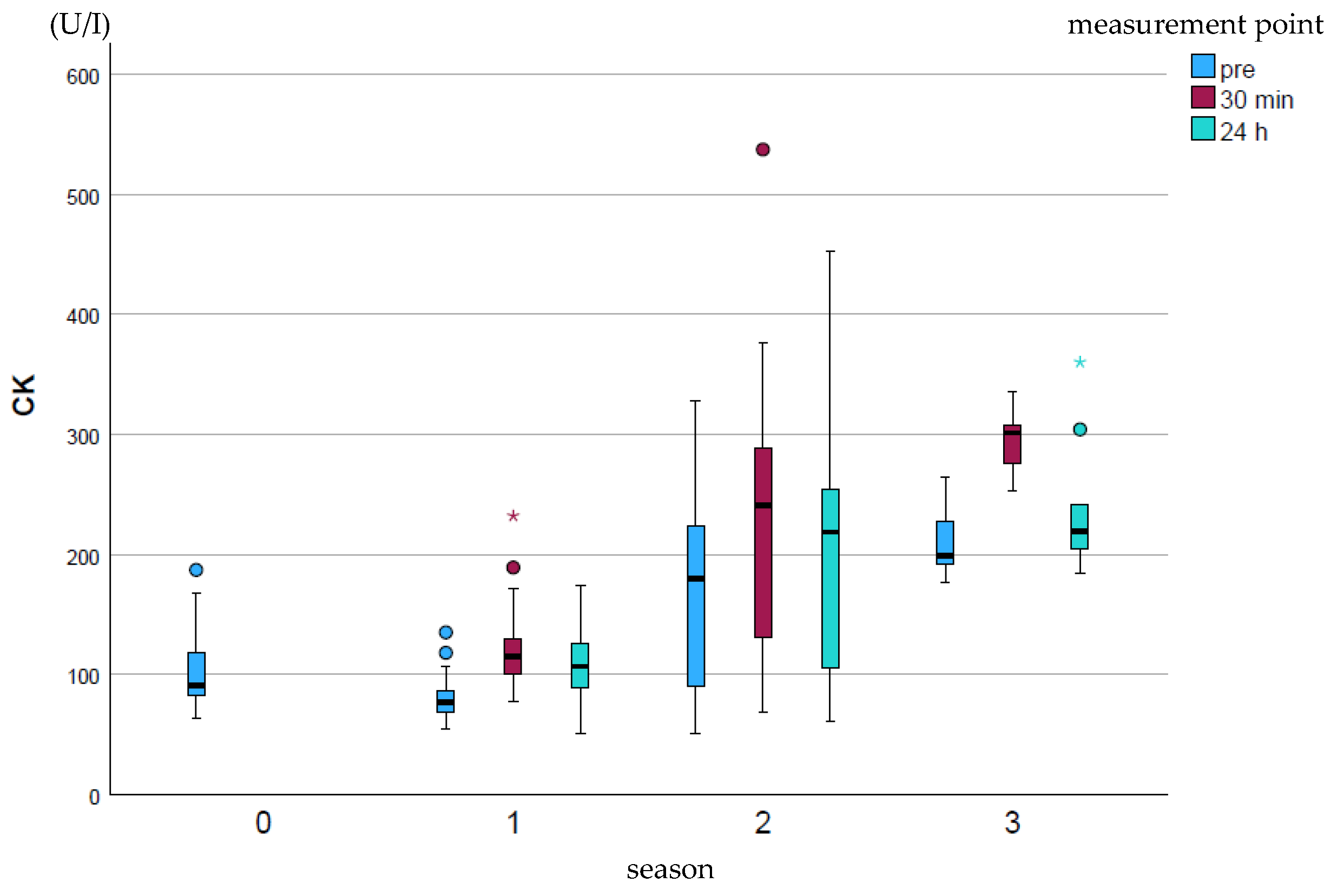 APA StyleRump-Dierig, I., Giers, J., Frenzel, C., Stöckle, S., & Gehlen, H. (2025). Seasonal Trends in Cardiac Troponin I Concentration and Creatine Kinase and Aspartate Aminotransferase Enzyme Activity in Relation to Myocardial Velocity Rates in Eventing Horses. Animals, 15(21), 3198. https://doi.org/10.3390/ani15213198