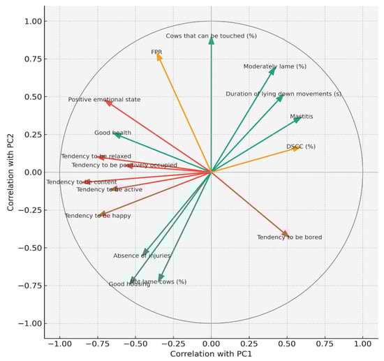 PCA correlation circle (PC1 vs. PC2) showing the contribution of milk biomarkers, production traits, and welfare indicators to the first two components. Vector direction indicates association, and length indicates contribution strength. The colours of the vectors are green = health and housing-related welfare indicators, red = emotional/affective indicators, and orange = milk biomarkers.