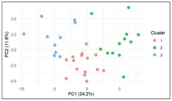 K-means clustering was performed on the standardised dataset to identify groups of farms with similar milk composition, production traits, and welfare profiles. The optimal number of clusters (k) was evaluated using three complementary methods: the Calinski–Harabasz index (Figure S2A, see the Supplementary Material), average silhouette width (Figure S2B in the Supplementary Material), and the gap statistic (Figure S2C in the Supplementary Material). Both the Calinski–Harabasz and silhouette indices indicated that k = 2 provided the most compact and well-separated solution, whereas the gap statistic suggested a more granular structure with k = 6. To ensure biological relevance and practical interpretability, a three-cluster solution (k = 3) was selected as a compromise, balancing statistical separation with the need to capture intermediate management–welfare profiles.