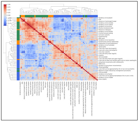 Hierarchical clustering heatmap showing how variables group together based on their similarity across farms. Each row represents one variable, and the branching tree (dendrogram) shows which variables are most closely related. Colours indicate the three main domains: green for metabolic–nutritional (feeding balance and milk traits), orange for behavioural–comfort variables (housing, comfort, positive behaviours), and blue for clinical–hygiene variables (udder health, dirtiness, mortality). Variables on the same branch share similar patterns, meaning that farms with high values for one variable often have high (or low) values for the others in the same group.