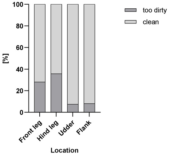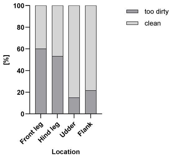 Percentage of too dirty and clean scored cows (n = 613) for the front legs, hind legs, udders and flanks in the warm season.