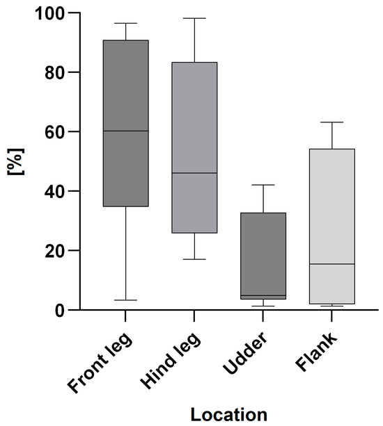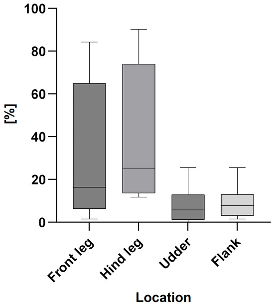 Percentage of too dirty scored cows on farm level (n = 8) for the front legs, hind legs, udders and flanks in the warm season expressed as box plots: median; Q 5/95.
