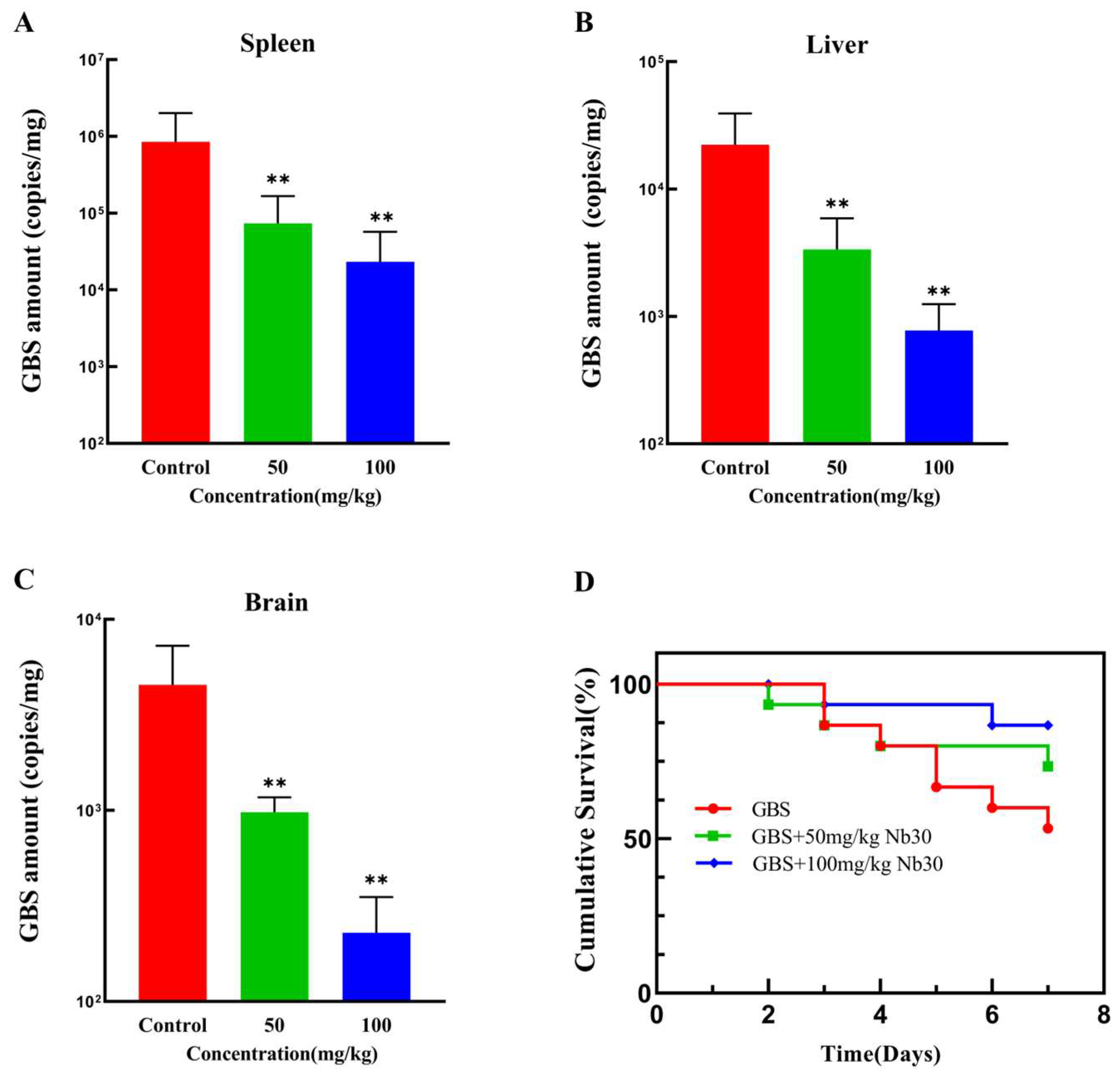 3.3. Nb30 Improves Survival Rate and Inhibits GBS Infection in Tilapia