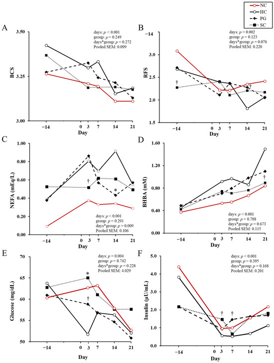 Figure 1A–I present the longitudinal changes in physical scores and blood biochemical parameters throughout the study period. No significant differences in BCS were observed in the treated cows. However, the RFS of the SC cows tended to be lower than that of the HC cows at −14 DIM and tended to be higher at 14 DIM (p < 0.10).
