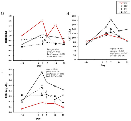 Liver function was assessed using the AST activity and T-Bil concentration (Figure 1H,I). The AST activity of the SC cows tended to be lower than that of the HC cows at 7 DIM (p < 0.10). T-Bil concentrations in the HC cows were significantly higher than those in the PG and SC cows at 3 DIM (p < 0.05), tended to be higher at 7 DIM, and showed a trend similar to the PG cows at 14 DIM (p < 0.10).