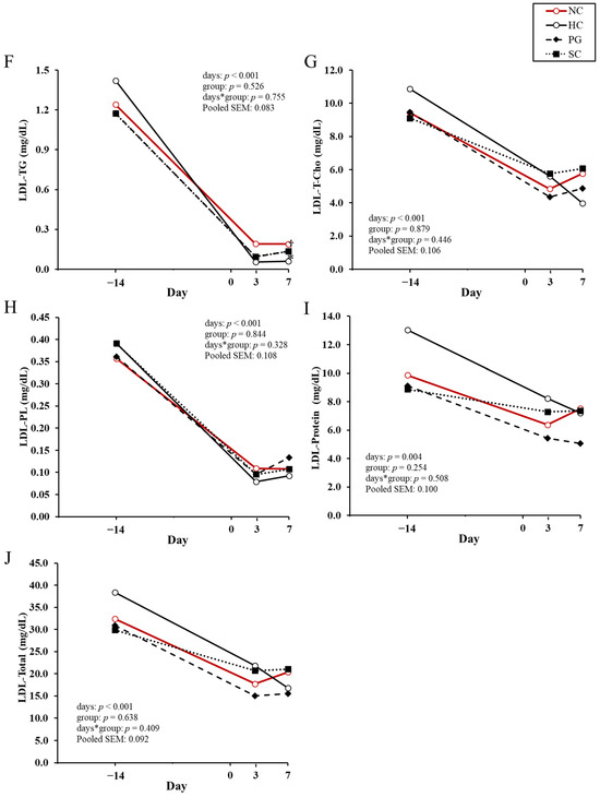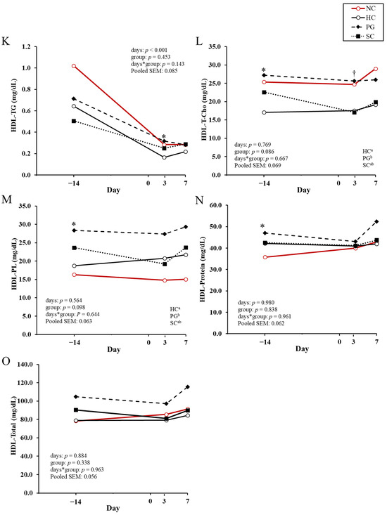 The concentrations of the lipoprotein components and total lipoprotein concentrations before and after calving are shown for VLDL, LDL and HDL in Figure 2A–E, Figure 2F–J, and Figure 2K–O, respectively. Both VLDL-protein (Figure 2D) and VLDL-total concentration (Figure 2E) showed a significant interaction between day and treatment group, and the HC cows had significantly lower concentration than the PG cows at 7 DIM (p < 0.05). LDL-TG concentrations (Figure 2F) at 7 DIM were significantly higher in the PG cows and tended to be higher in the SC cows than in the HC cows (p < 0.05 and p < 0.10, respectively). The HDL-TG concentration (Figure 2K) at 3 DIM was significantly lower in the HC cows than in the PG cows (p < 0.05). The HDL-T-Cho concentration (Figure 2L) in the HC cows was significantly lower than that in the PG cows at −14 DIM (p < 0.05) and tended to be lower at 3 DIM (p < 0.10). Throughout the entire study period, the HDL-T-Cho concentration in the PG cows tended to be higher than in the HC cows (p = 0.086). At −14 DIM, HDL-PL (Figure 2M) and HDL-protein (Figure 2N) concentrations were significantly higher in the PG cows than in the HC cows (p < 0.05). Throughout the entire study period, the HDL-PL concentration in the HC cows tended to be lower than that in the PG cows (p = 0.098).