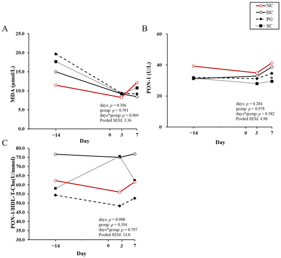 Enhanced oxidation of NEFA in the liver increases the production of reactive oxygen species (ROS), leading to elevated oxidative stress [12,63,64]. Oxidative stress results from an imbalance between lipid peroxides and antioxidant enzymes that neutralize them [65]. MDA, a byproduct of lipid peroxidation, is commonly used as a primary indicator of this process [66]. According to Senoh et al. (2019), cows that developed subclinical ketosis (SCK) had significantly higher serum MDA concentrations before and after calving than healthy control cows [13]. In the present study, MDA concentrations in all treated cows were higher than those in the NC cows at 14 DIM; however, no significant differences were detected among the three groups throughout the study period (Figure 3A). Although a reduction in the MDA concentration was anticipated with the preventive administration of PG or SC, no clear effect was observed. The average prepartum serum NEFA concentration in the cows used by Senoh et al. (2019) ranged from 0.22 to 0.24 mEq/L [13], whereas those in the cows included in the present study ranged from 0.3 to 0.8 mEq/L, indicating a more pronounced negative energy balance. Consequently, it is presumed that the extent of hepatic lipid peroxidation may have been greater in the cows of the present study.