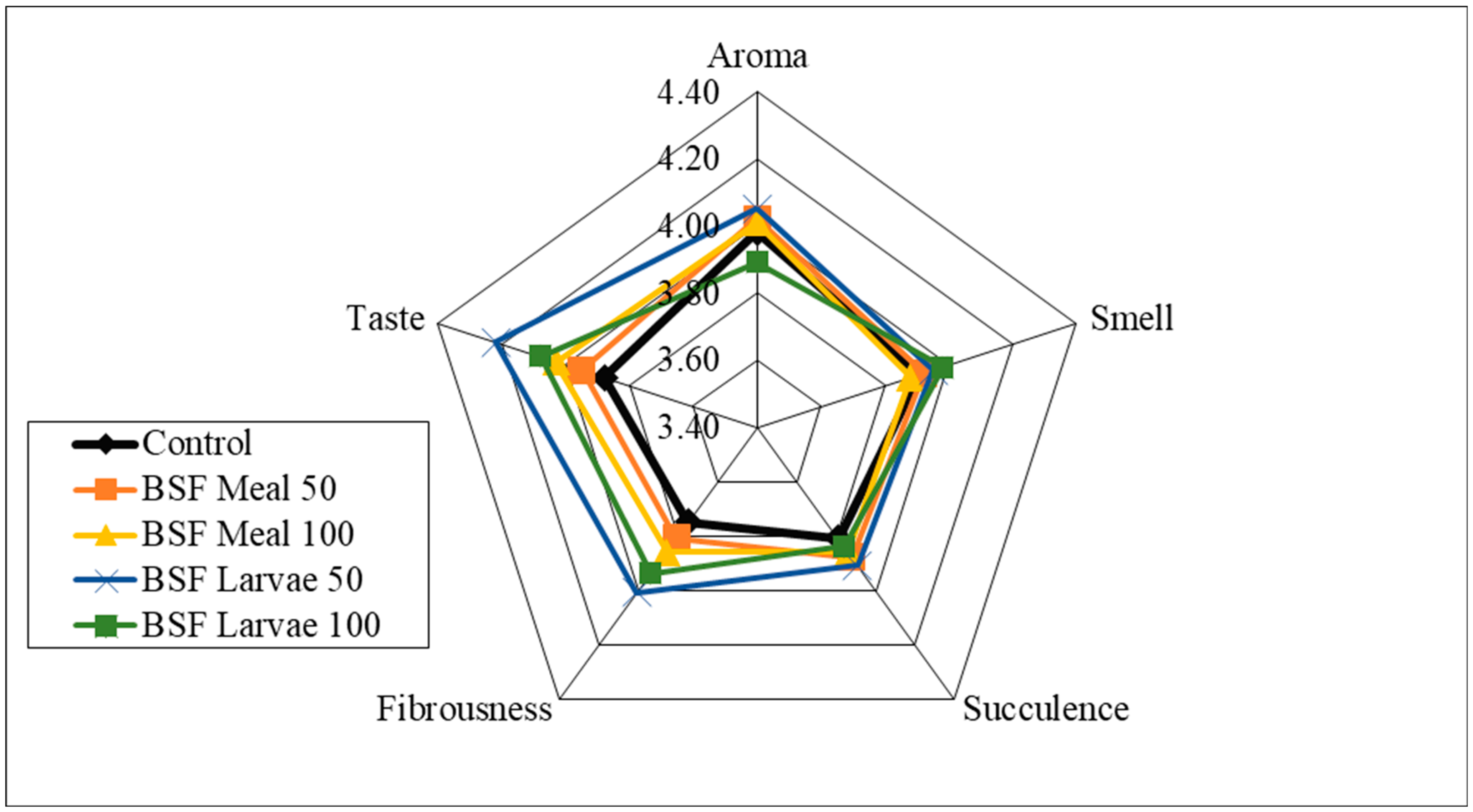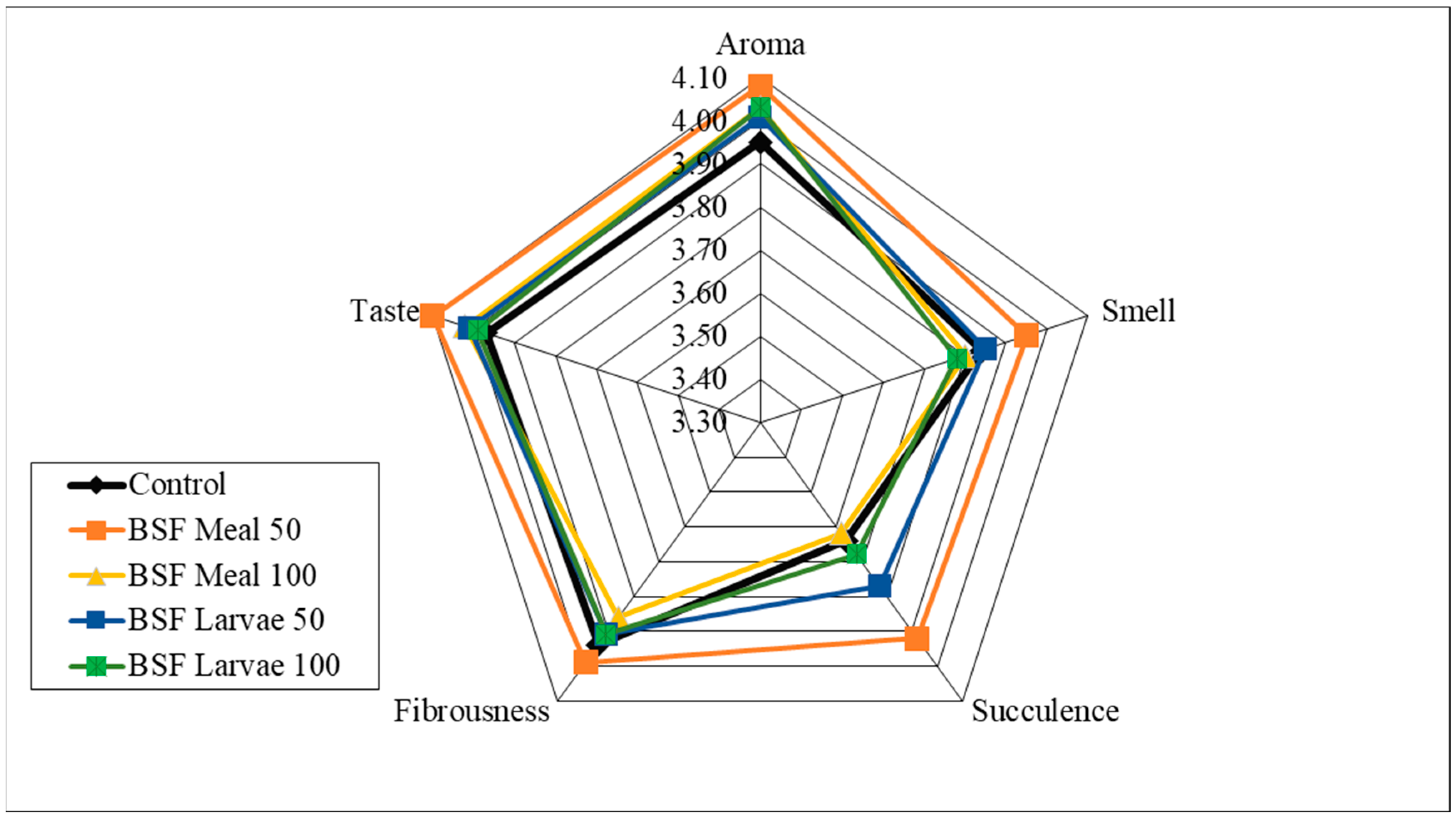 - Fiorilla, E.; Gariglio, M.; Gai, F.; Zambotto, V.; Bongiorno, V.; Cappone, E.E.; Rødbotten, R.; Koga, S.; Rieder, A.; Tengstrand, E.; et al. Breaking down barriers: Live or dehydrated dietary whole black soldier fly larvae supplementation in slow-growing chickens preserves meat quality and sensory traits. Poult. Sci. 2024, 103, 104120. [Google Scholar] [CrossRef]