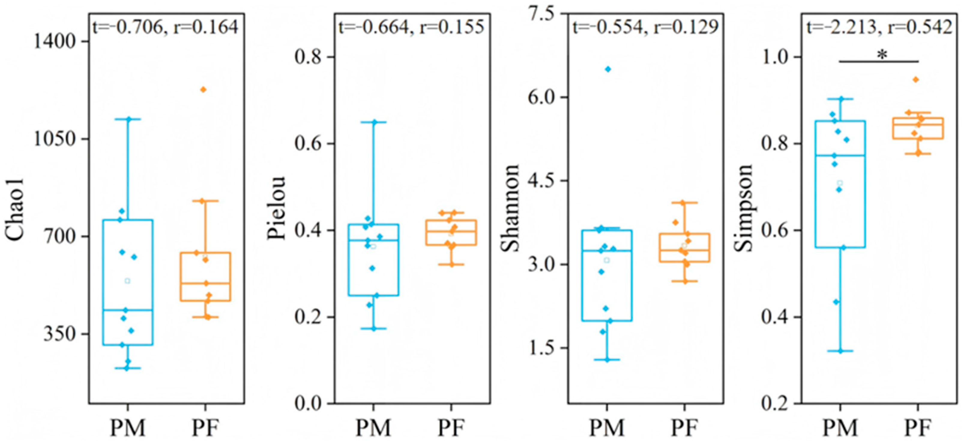 - Estaki, M.; Jiang, L.; Bokulich, N.A.; McDonald, D.; González, A.; Kosciolek, T.; Martino, C.; Zhu, Q.Y.; Birmingham, A.; Vázquez-Baeza, Y.; et al. QIIME 2 enables comprehensive end-to-end analysis of diverse microbiome data and comparative studies with publicly available data. Curr. Protoc. Bioinform. 2020, 70, e100. [Google Scholar] [CrossRef] [PubMed]