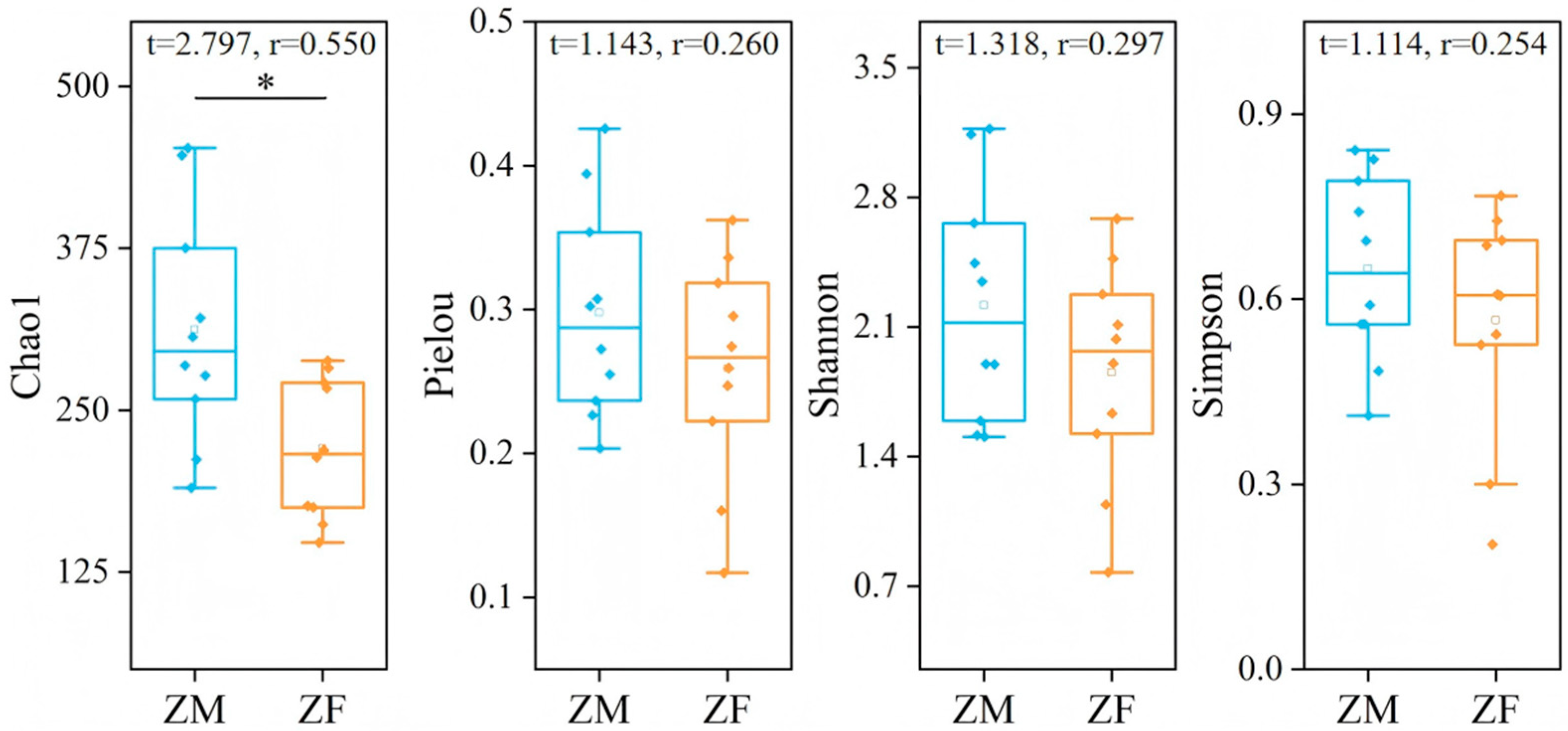 APA StyleXue, F., Zhu, X., Qin, L., Guo, Y., Sun, J., Dang, Z., Hua, L., Chu, B., & Hua, R. (2025). Sex-Based Dietary Divergence in Plateau Pikas (Ochotona curzoniae) but Not Plateau Zokors (Eospalax baileyi). Animals, 15(21), 3216. https://doi.org/10.3390/ani15213216