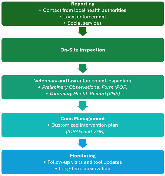The proposed protocol represents an initial step toward standardizing interventions through shared, replicable, and adaptable instruments. The three integrated tools—the Preliminary Observational Form (POF), the Clinical-Relational Interview for Animal Hoarding (ICRAH), and the Veterinary Health Record (VHR)—form a structured operational framework enabling systematic data collection, tailored intervention planning, and longitudinal monitoring of each case.