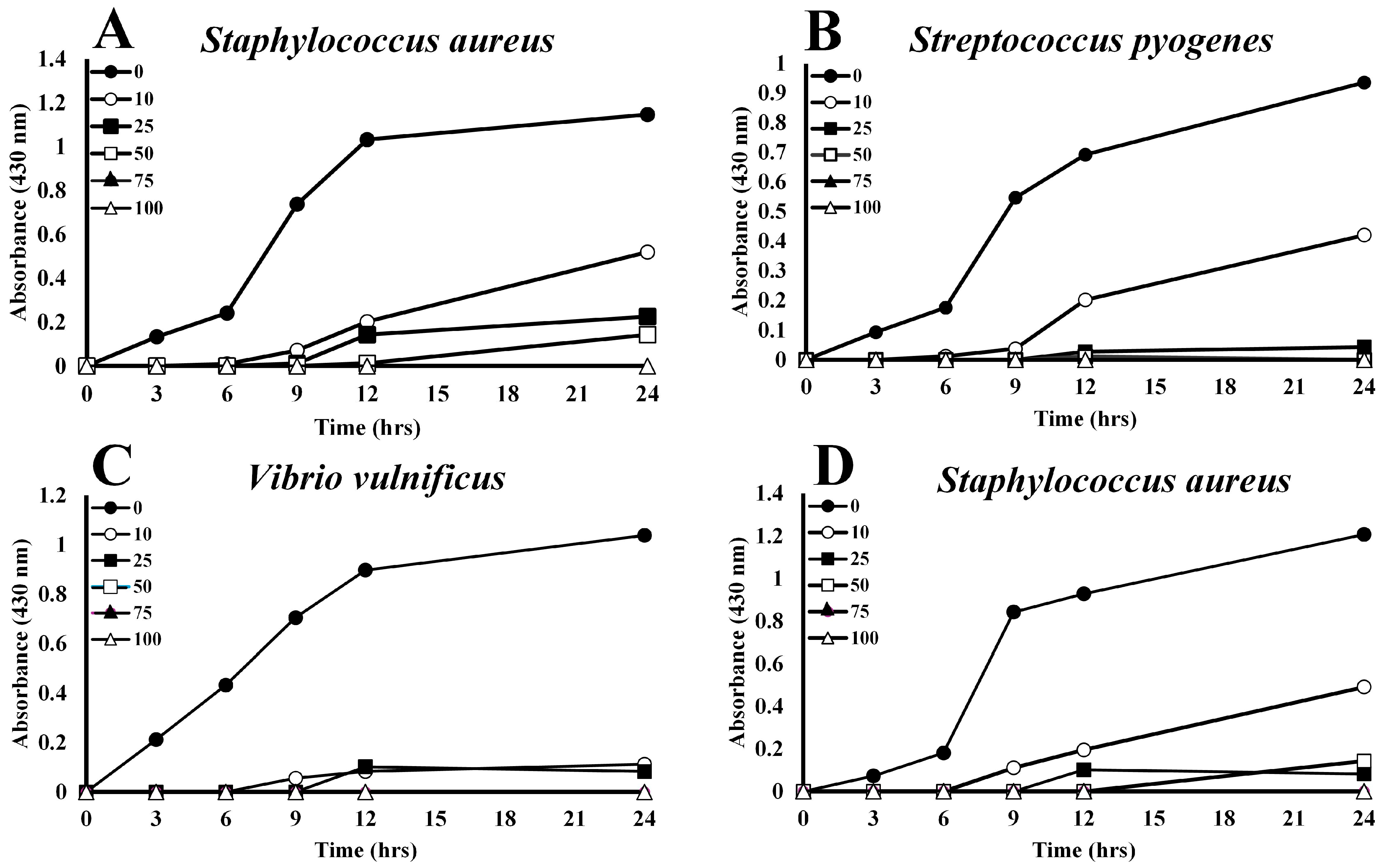 Concentration-dependent inhibition of bacterial growth by A. piscivorus plasma. Culture tubes containing 2 mL of 0, 10, 25, 50, 75 or 100% plasma from A. piscivorus were inoculated with 106 CFU different bacterial species and 150 mL were transferred to microtiter plates. Plates were incubated at 37 °C, and their optical densities were monitored (430 nm) at 0, 3, 6, 12, and 24 h post-inoculation. The results are expressed as the means ± standard deviations. for four independent determinations.