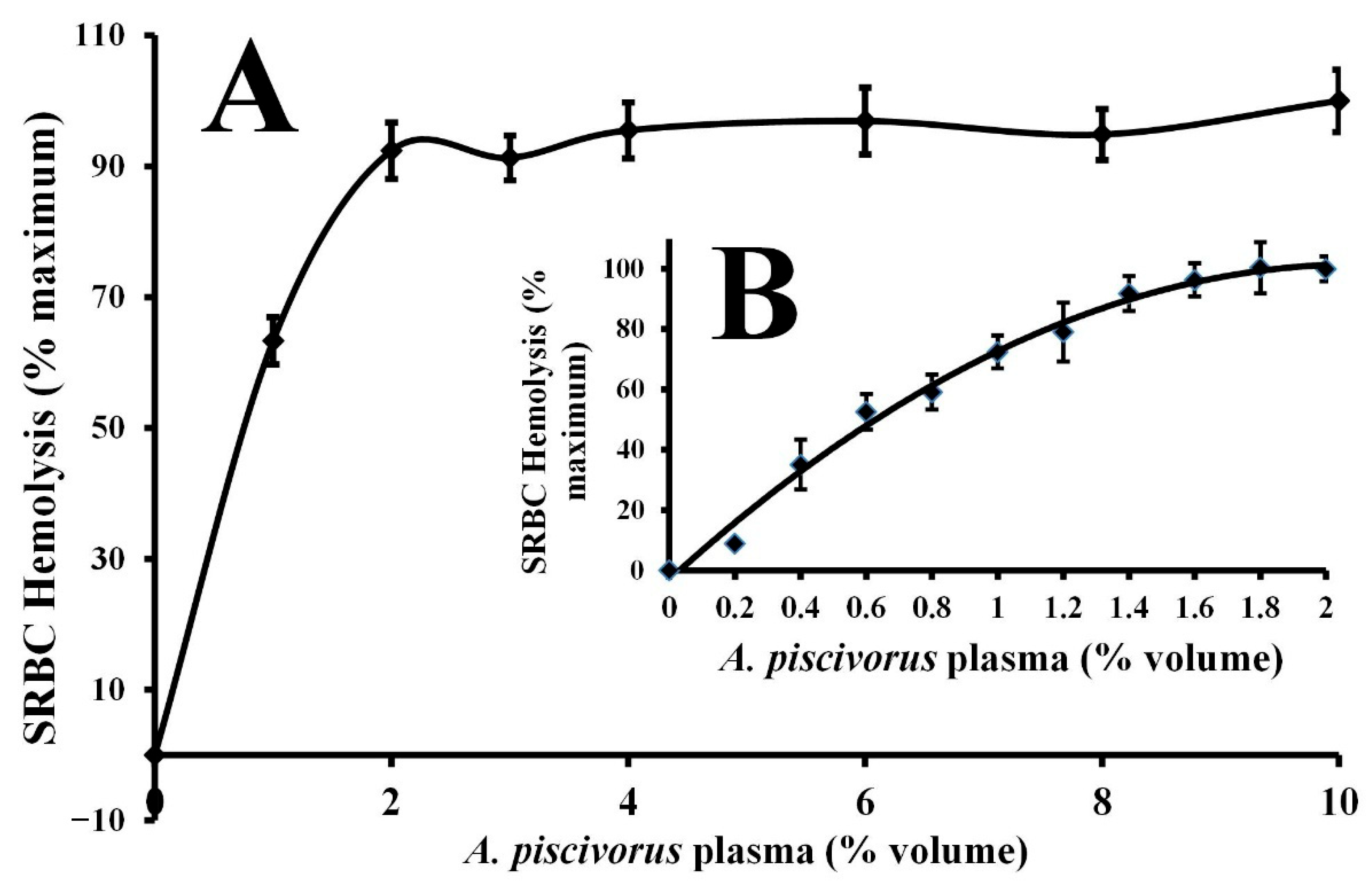 Volume-dependent hemolysis of SRBCs by plasma derived from A. piscivorus. (A) Different volumes (0–10% volume, in 1–2% increments) of pooled plasma samples were diluted in sterile saline and incubated with 1% SRBCs for 30 min at ambient temperature. (B) Different volumes (0–2% volume, in 0.2% increments) of pooled plasma samples were diluted in sterile saline and incubated with 1% SRBCs for 30 min at ambient temperature Hemolysis activity was determined by spectrophotometry at 540 nm and expressed as % maximum as compared to a complete hemolysis positive control. The data represent means ± standard deviations for four independent determinations.