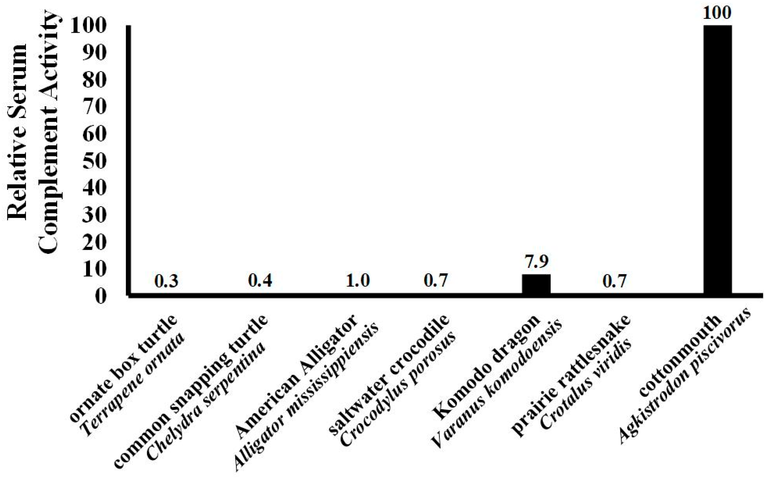 The strong hemolytic response of plasma derived from A. piscivorus (Figure 2) exhibited an EC50 for the hemolysis of SRBCs that was less than 0.62% plasma (Figure 3). This value is extremely low when compared to other values of other diverse reptiles (Figure 4) such as the American alligator (Alligator mississippiensis, EC50 = 6.0%) [], Saltwater crocodile (Crocodylus porosus, EC50 = 8.67%) [], prairie rattlesnake (Crotalus virdis, EC50 = 8.87%) [], common snapping turtle (Chelydra serpentina, EC50 = 16.2%) [], ornate box turtle (Terrapene ornata, EC50 = 24.4%) [], and Komodo dragon (Varanid komodoensis, EC50 = 4.9%) [].