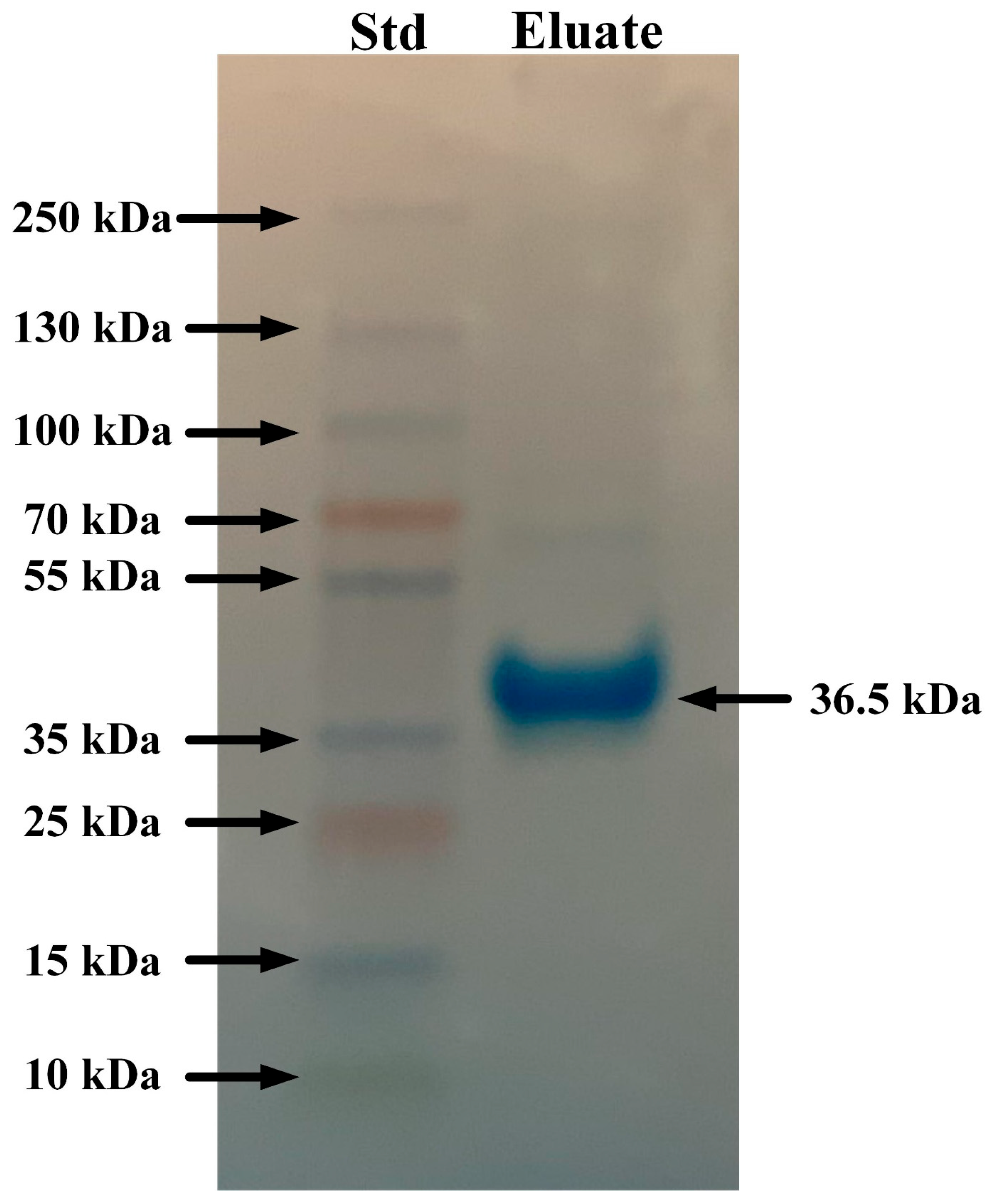 Mannan-agarose affinity chromatography coupled with SDS-PAGE analysis showed that A. piscivorus expressed high quantities of a protein of approximately 36 kDa (Figure 6). The results from the protein gel also show a very light band at ~70 kDa that near the lower limit of detection, which is most likely a dimer of 36 kDa. The C-type lectin that binds mannan on the surface membranes of microbes is known to dimerize and then form a tetramer in its functional form []; this band on the gel is likely an artifact as the SDS and b-mercaptoethanol failed to completely separate the lectin subunits, and this band had been observed in greater quantities during other studies conducted in our laboratory [,,].