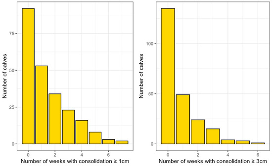 The distribution of calves based on the number of weeks with consolidation is visualized in Figure 1.
