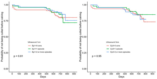 Kaplan–Meier survival curve showing the probability of not being culled before calving for calves grouped by the number of episodes (Ep) with ≥1 cm (left panel, Ep1) or ≥3 cm (right panel, Ep2) lung consolidation.