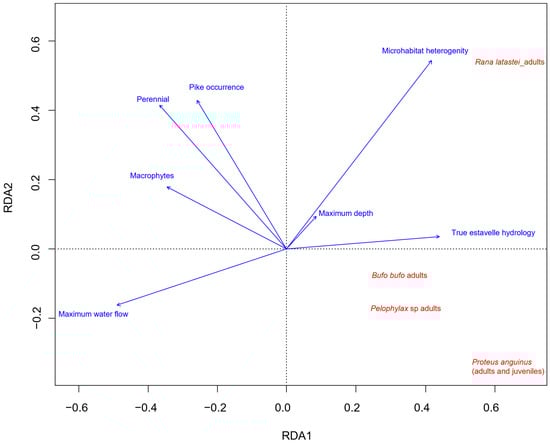 We used a constrained redundancy analysis (RDA) to evaluate the relative role of spring features on the amphibians’ species composition. RDA allows evaluation of how much of the variation in the structure of one dataset (e.g., amphibian community composition in springs; endogenous dataset) is explained by independent variables (e.g., spring abiotic and biotic features; exogenous datasets) []. We built a matrix of environmental features considering the whole study period and composed it by the following: (1) the maximum water flow that we recorded; (2) if the spring dried up at least once during the whole study period; (3) the maximum depth reached by springs; (4) occurrence (or not) of aquatic macrophytes; (5) maximum heterogeneity of the microhabitat; (6) if the spring showed at least once during the whole study period the hydrological features typical of an estavelle; and (7) if we recorded pike occurrence at least once.