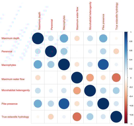 A correlation analysis considering the variables in the exogenous matrix showed that estavelles with pike presence are associated with greater maximum depth and the presence of aquatic macrophytes (Figure 5). In addition, maximum water flow was negatively correlated with microhabitat heterogeneity (Figure 5).