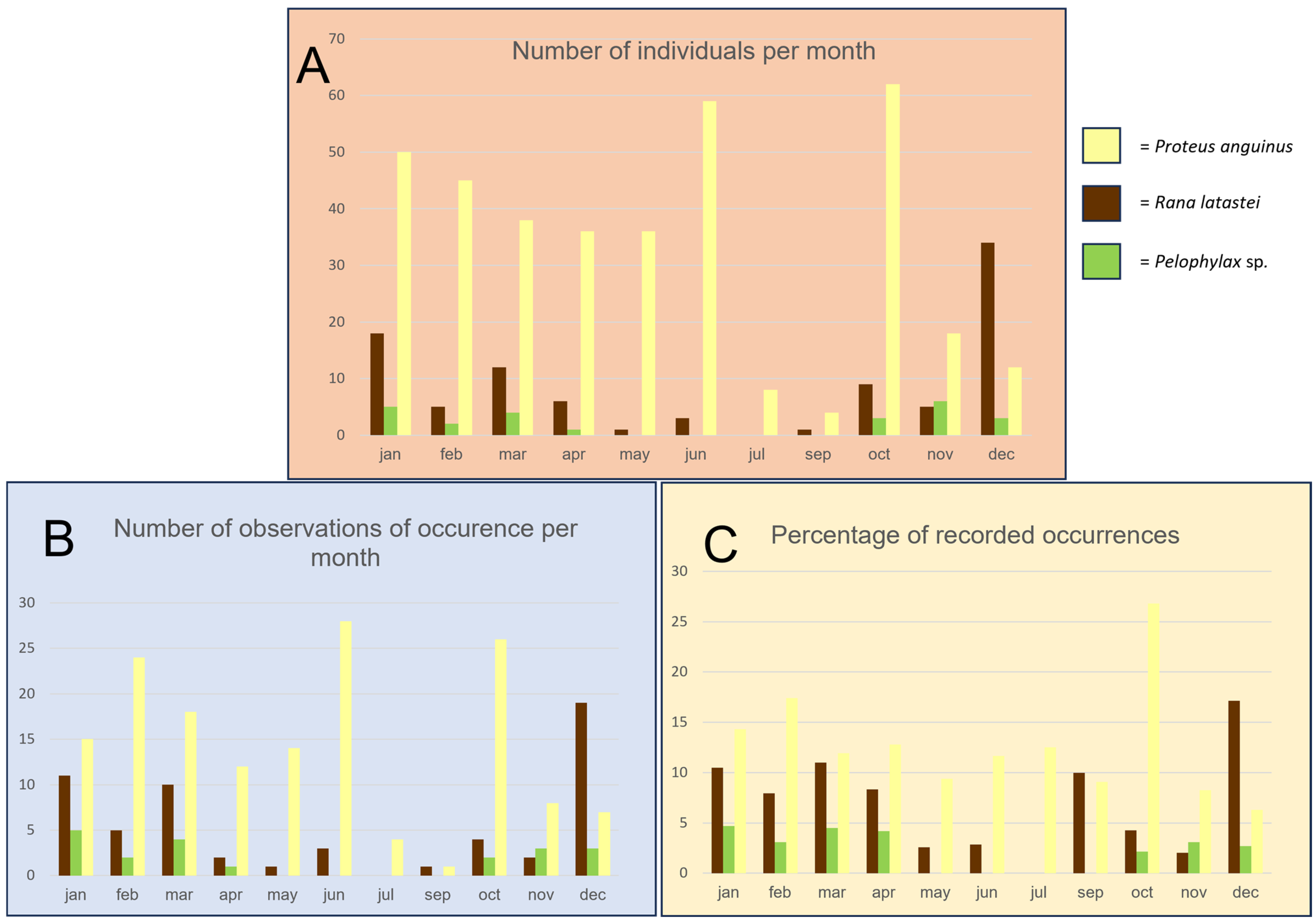 - Manenti, R.; Di Nicola, M.R.; Zampieri, V.; Grassi, G.; Creanza, T.; Mauri, E.; Ficetola, G.F.; Barzaghi, B. Wandering outside of the Styx: Surface activity of an iconic subterranean vertebrate, the olm (Proteus anguinus). Ecology 2024, 105, e4252. [Google Scholar] [CrossRef]
