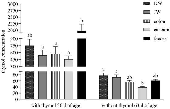14] with application of thyme essential oil in poultry diets. These authors pointed to the efficient absorption of thymol from the gut content into the duodenal wall. In our study, the amount of thymol in plasma after its withdrawal was below the limit of quantitation, which indicated that thymol was no longer being ingested through feed. Thymol was detected above the limit during the period without thymol addition in all intestinal segments, and the highest concentrations in DW and JW indicated continuous biotransformation processes also during this period (