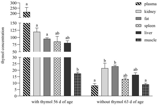During the period with thymol addition, its concentrations were above LOQ in the entire intestinal tract as well as examined tissues and organs, but during the period without supplementation, its concentrations were below LOQ in plasma, spleen and muscle (