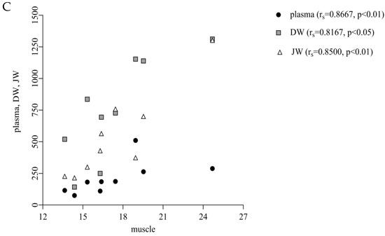 21]. In this context, we suggest that thymol undergoes metabolic conversion into hydrophilic metabolites, which are subsequently cleared via the renal route, thereby explaining the strong correlation between the plasma and kidney concentrations observed in our study. Similarly, the positive correlations between plasma and muscle (r