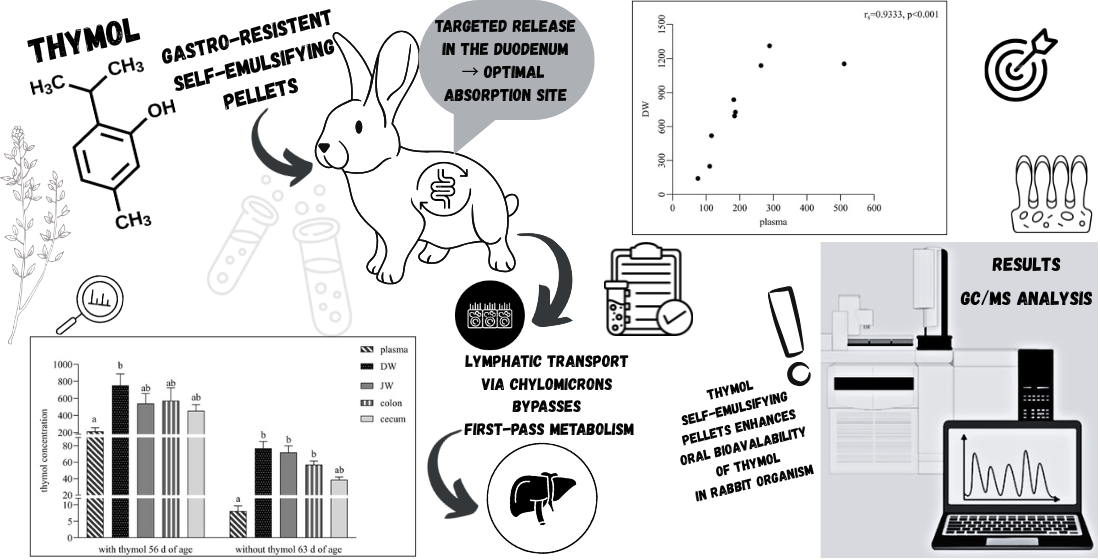 To enhance the oral bioavailability of thymol and achieve a more efficient therapeutic effect, our study aimed to provide a detailed characterisation of its metabolic pathway in the rabbit organism following the dietary administration of thymol self-emulsifying pellets. We expect that our study will provide an answer to whether this form of thymol ensures more effective absorption in the small intestine as well as its greater accumulation in the tissues, which would subsequently result in a more effective impact on the health status of rabbits.
