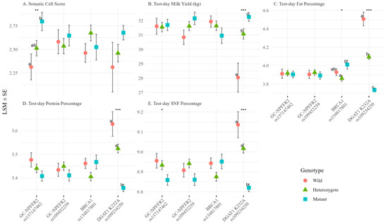 Genotype effects on test-day traits. (A) Somatic Cell Score, (B) Test-day Milk Yield (kg), (C) Test-day Fat Percentage, (D) Test-day Protein Percentage, and (E) Test-day Solids-not-fat (SNF) Percentages are shown for four candidate SNPs. Least squares means (LSMs ± SE) were estimated using linear mixed models including DIM stage, parity group, and season as fixed effects and cow ID as a random effect. For genotype main effects, significance was assessed by ANOVA (* p < 0.05; ** p < 0.01, *** p < 0.001). Different letters indicate statistically significant differences between genotypes (Tukey’s HSD test, p < 0.05).