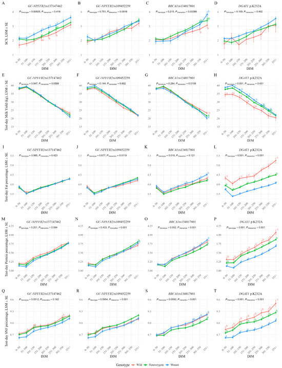 LSM ± SE of test-day SCS and milk production traits across lactation stages by genotype. Panels (A–D): SCS; (E–H): milk yield; (I–L): fat%; (M–P): protein%; (Q–T): SNF. Each row corresponds to one SNP: GC-NPFFR2 rs137147462 (A,E,I,M,Q), GC-NPFFR2 rs109452259 (B,F,J,N,R), BRCA1 rs134817801 (C,G,K,O,S), and DGAT1 p.K232A (D,H,L,P,T). DIM were grouped by 50-day intervals up to 350 d, with recorded values after 350 d combined. Different letters indicate statistically significant differences between genotypes (Tukey’s HSD test, p < 0.05).
