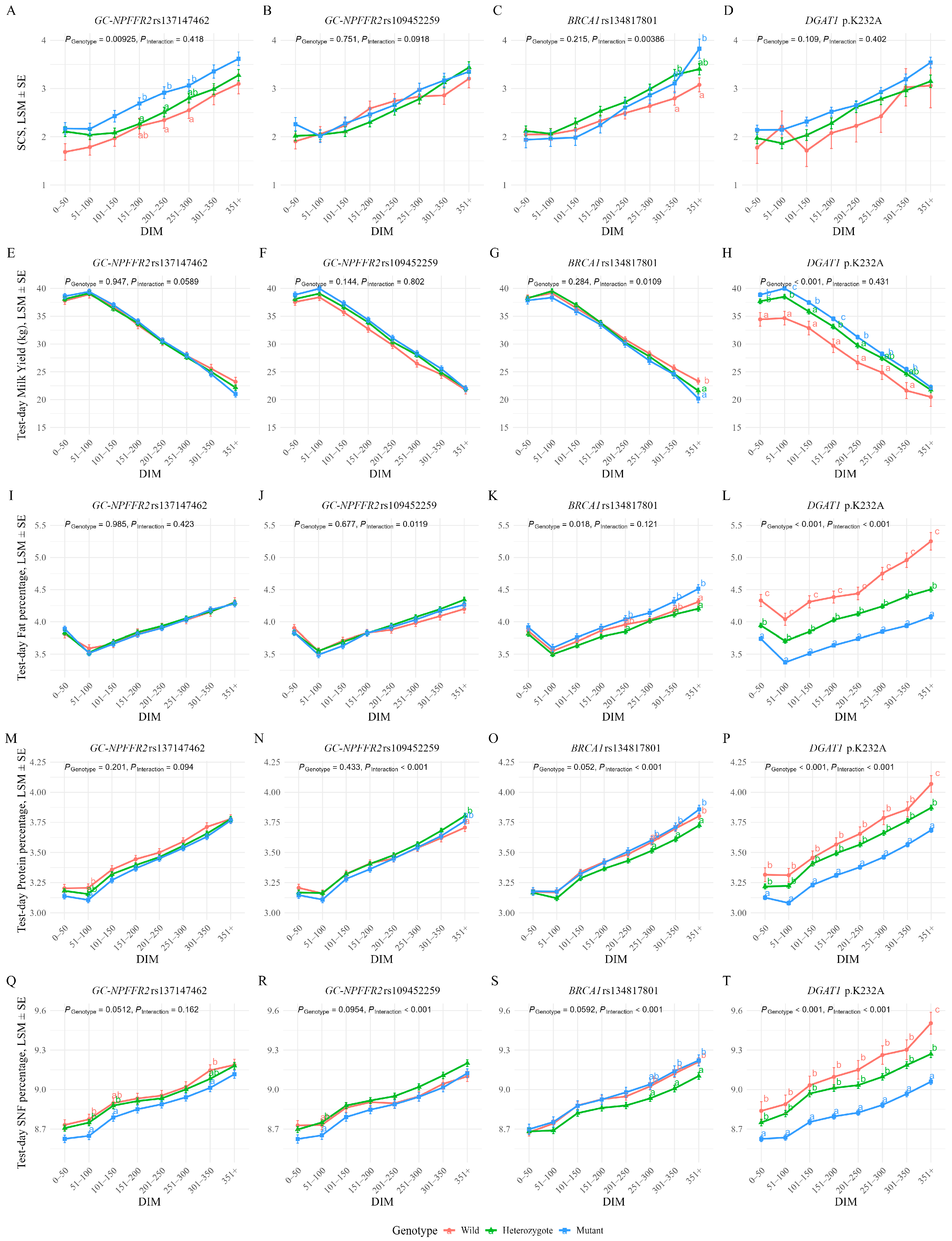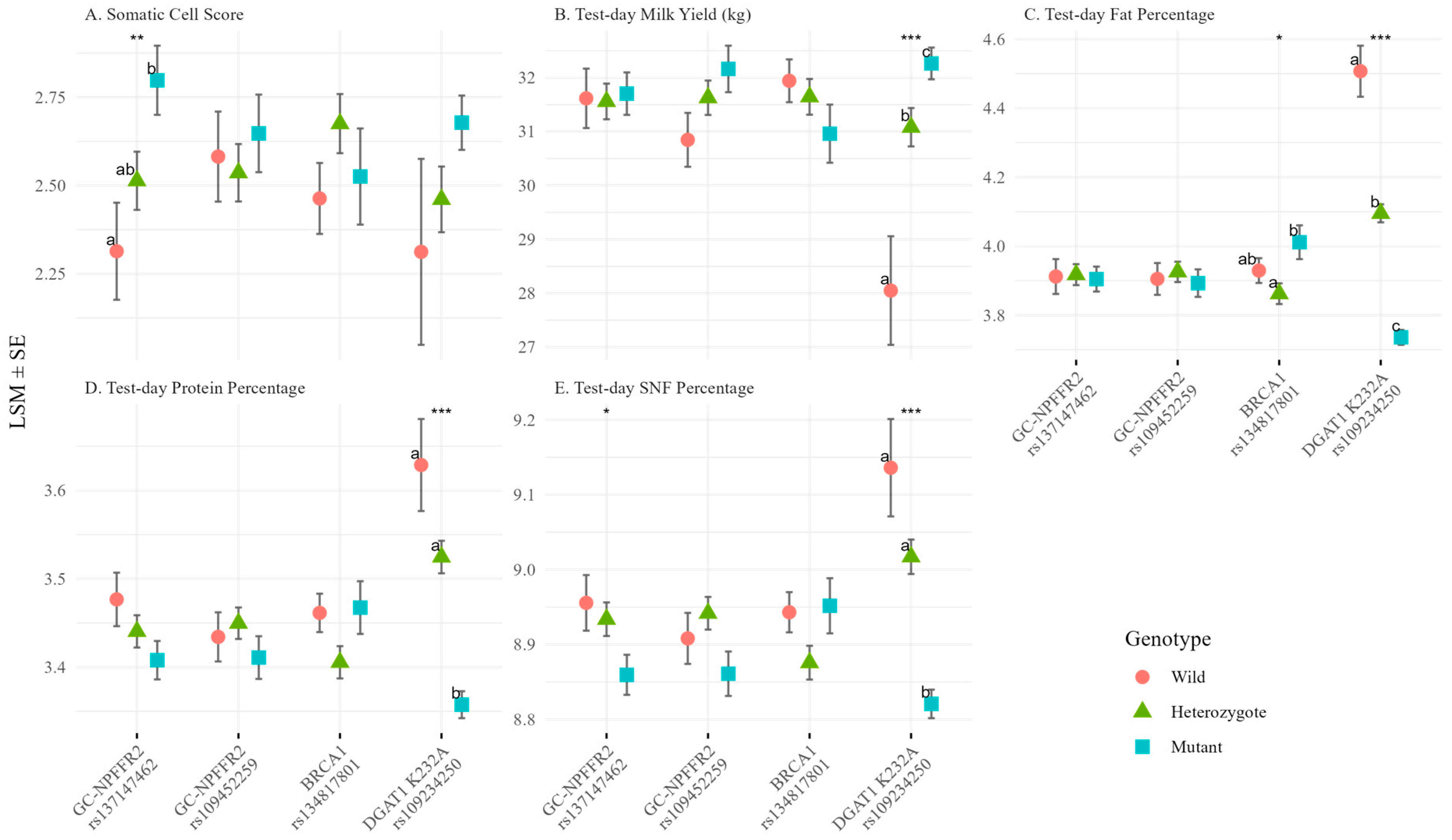 3.2. Main Effects of Genotype on Test-Day Milk Production and Somatic Cell Score