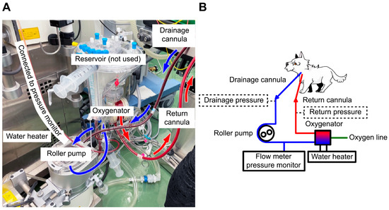 Heparin (300 U/kg) was administered intravenously, and the measured activated clotting time (ACT) (i-STAT ACT Kaolin; Abbot Japan, Tokyo, Japan) was longer than 250 s. A 10-Fr drainage cannula (Flexmate; Toyobo, Shiga, Japan) was inserted into the left external jugular vein, and a 6-Fr return cannula (DLP Cardiopulmonary Bypass Cannula; Medtronic, Minneapolis, MN, USA) was inserted into the common carotid artery. The dog was connected to an oxygenator and circuit (MERA-HP-Exelung TPC; Senko Medical Instrument, Tokyo, Japan) with a priming volume of 150 mL to establish VA-ECMO (Figure 2).