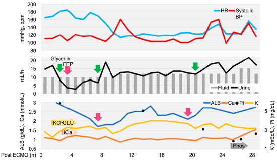 Timeline to extubation after extracorporeal membrane oxygenation withdrawal. Heart rate (HR) and systolic blood pressure (SYS BP) are written on top, fluid volume and urine output in the middle, and albumin (ALB), potassium (K) ion calcium (iCa), and phosphate (iP) below. The reason and timing of glycerol (green) and FFP (pink) administration are indicated by arrows. K, calcium gluconate, glucose, and sodium phosphate were adjusted based on blood test results, approximately every 30–90 min, with continuous infusions started at the arrowed positions.