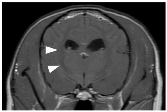 Contrast-enhanced T1-weighted magnetic resonance image of the brain. No common ECMO-related complications suggestive of cerebral herniation due to thrombus, hemorrhage, or edema are observed. However, the white matter exhibits an overall low signal (arrowhead), suspected as brain damage caused by the prolonged hypoxia before ECMO was introduced. ECMO, extracorporeal membrane oxygenation.