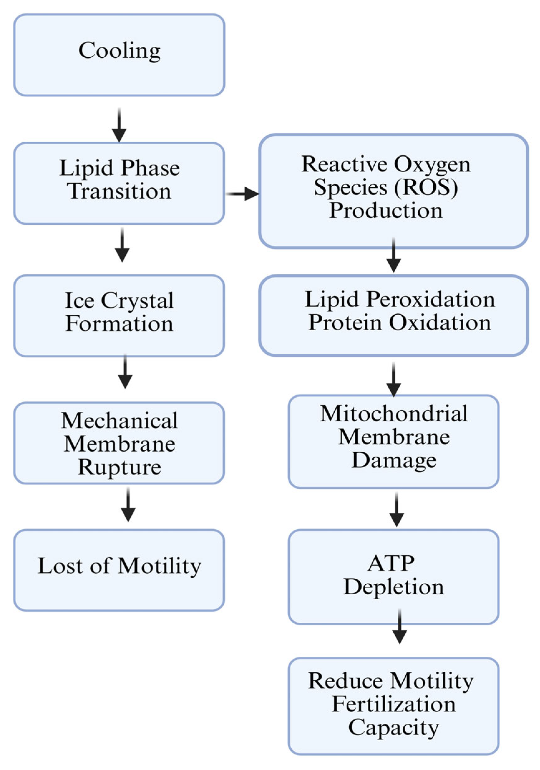 Figure 3. Mechanisms of freeze–thaw damage; schematic representation of the main cellular and molecular events associated with cryoinjury during the freeze–thaw process. Cooling induces lipid phase transition and ice crystal formation, leading to mechanical membrane rupture and loss of motility. Simultaneously, reactive oxygen species (ROS) are produced, causing lipid peroxidation, protein oxidation, and mitochondrial membrane damage. These processes result in ATP depletion, reduced motility, and decreased fertilization capacity.