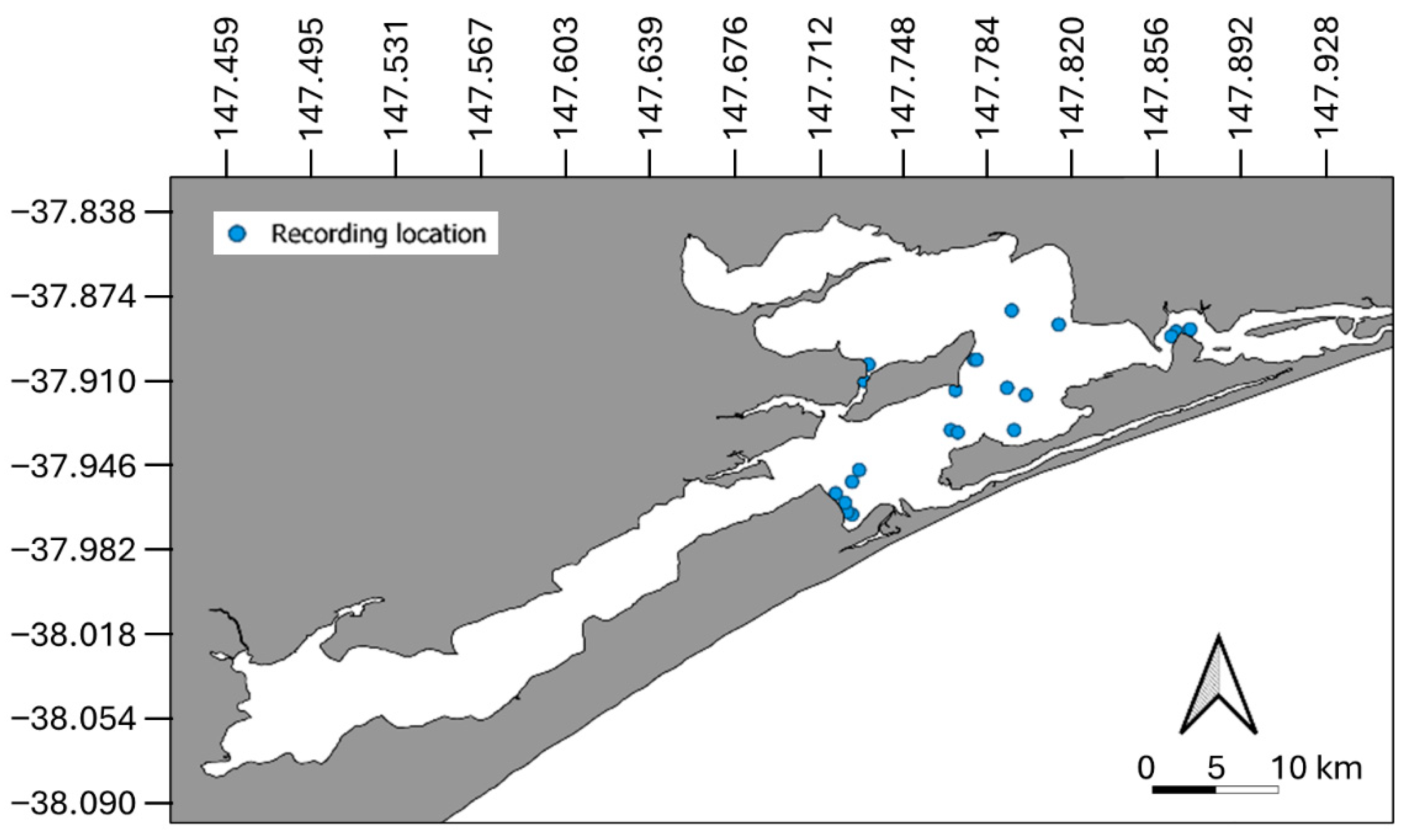 - Beddoe, J.; Shimeta, J.; Klaassen, M.; Robb, K. Population distribution and drivers of habitat use for the Burrunan dolphins, Port Phillip Bay, Australia. Ecol. Evol. 2024, 14, e11221. [Google Scholar] [CrossRef]